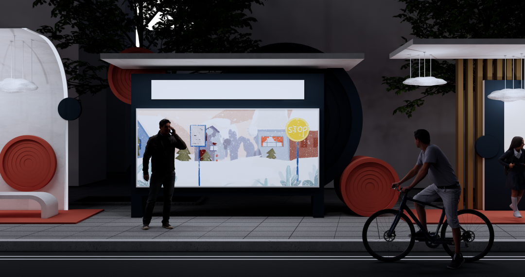 “公交车候车亭是人们日常生活中必不可少的公共设施, 其最重要的功能就是满足出行候车的基本要求,为人们提供遮阳避雨的等候空间, 还能在等候时及时了解相关车次信息等。设计通过对公交车站的需求进行调研,设计了一种新型公交车站候车亭,造型满足人们对审美的要求,同时也能满足环保节能,并且具有可持续发展的潜力。”
