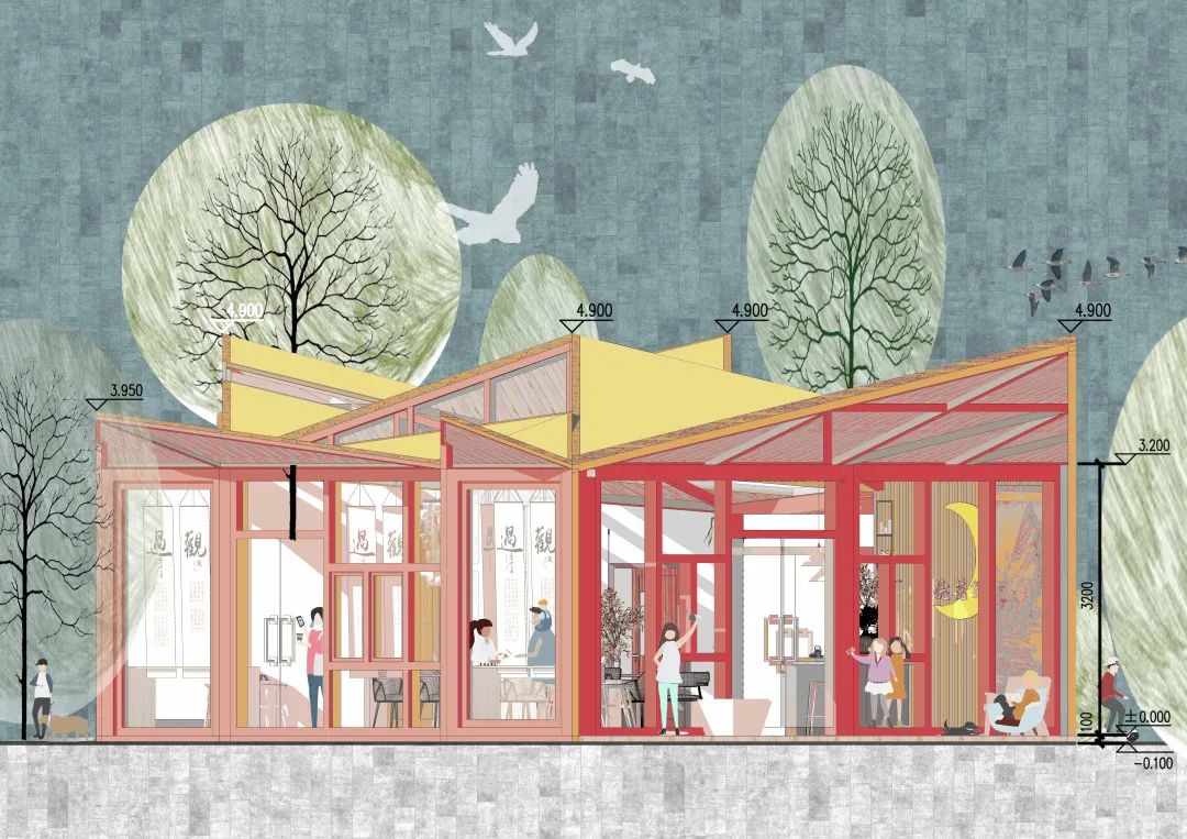 最后,关于作品的细节,陈思雅、有静怡两位同学是这样阐述的:“该设计借自然之景,展山湖之韵,营生态之道,打造江夏诗风画韵风景道。驿站兼顾公园管理和游客休憩功能。建筑总面积170平方米,总高度不超过5米,外立面采用大面积多角度通透玻璃,可将外部景色引入室内,为游客提供观山关湖的休闲体验。功能空间设计采用公共空间和半公共空间结合,体现了人性化的服务;灯光的设计以暖光为主,与自然光结合营造出一种温馨的氛围,打造归属感。整体建筑很少使用合成材料,屋顶开有天窗能充分利用阳光,节省能源,也为游客们创造出一种接近自然的感觉。我们的设计以人、建筑和自然环境的协调发展为目标,在利用天然条件和人工手段创造良好、健康的环境的同时,尽可能地控制和减少对自然环境的使用和破坏,充分体现向大自然的索取和回报之间的平衡和追求生态自然体现健康主题的特色。”