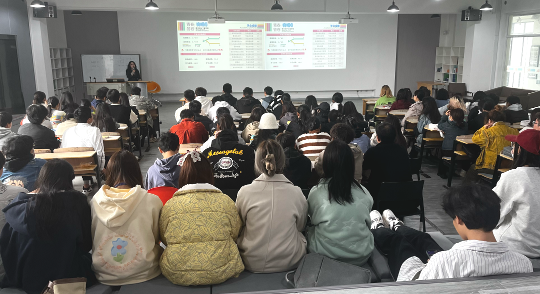 随后,梅煜萱同学展开了分享,她按“五个一”概括了她的经验心得。重点提出了作为大学新生,要树立明确的目标,把握好时间,积极参加活动,碰到困惑积极与老师沟通,要勇于走出自己的舒适区去尝试去挑战自己。