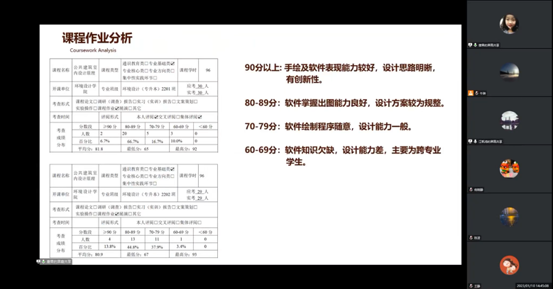 2023年1月10日,寒假刚开始环境设计专业就通过线上会议的方式,进行了2022-2023-1学期的专业课程的总结与分析,系主任牛琳主持会议,yl7703永利集团三个专业的教师、院领导都参与了此次会议。课程涉及本科、专升本、专科的15门专业课,会议进行了近8小时。