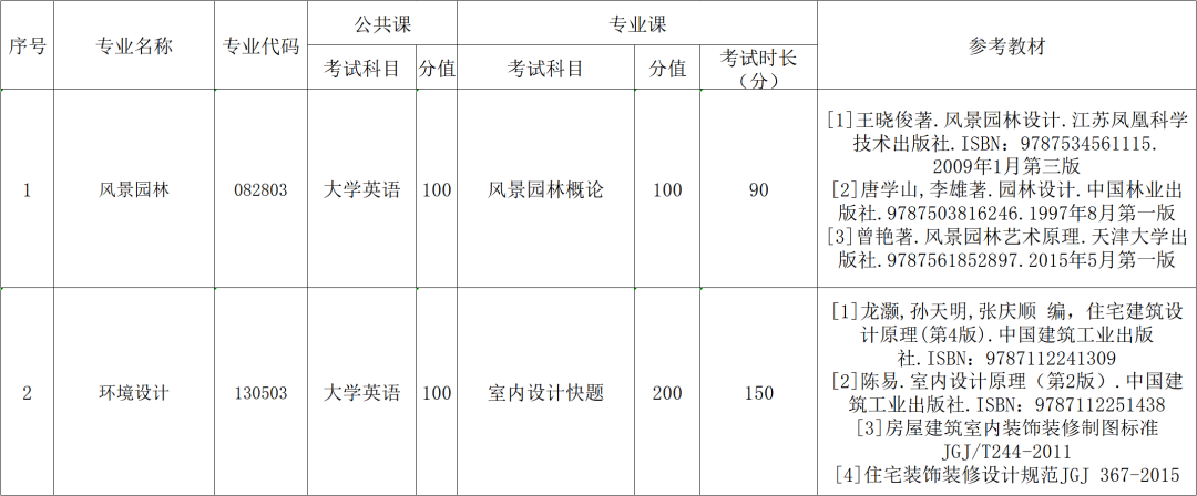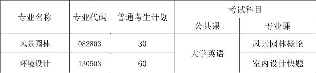 公共课科目为英语,英语命题、阅卷由全省统一安排。专业课科目由我校自主确定并命题、阅卷。考试大纲及参考教材参见2023年普通专升本《大学英语》考试大纲、2023年普通专升本《风景园林概论》考试大纲、2023年普通专升本《室内设计快题》考试大纲(附件)。