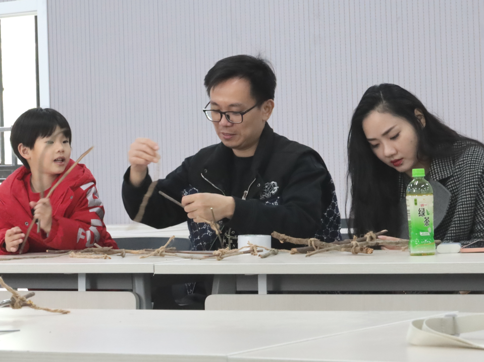 2023年3月25日下午,活动前志愿者们给每组家庭准备了小木棍、小剪刀、麻绳、透明胶带等等制作工具。志愿者和各个家庭一起完成了相框的制作,拿着麻绳将各个木棍固定好,再用胶带平整的将木框一边缠住,这样一个相框外形就完成了。