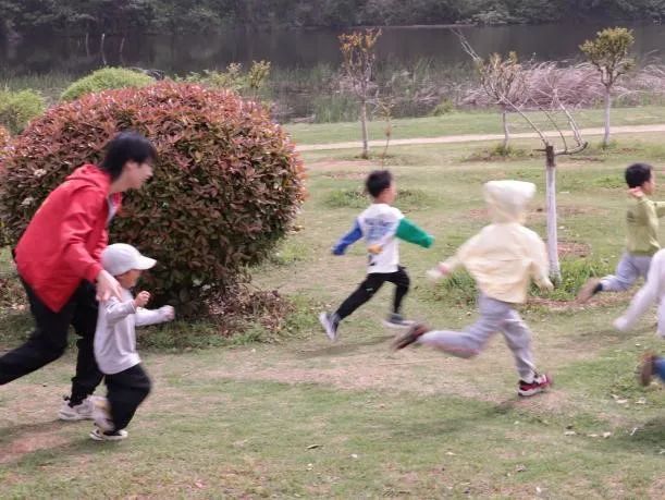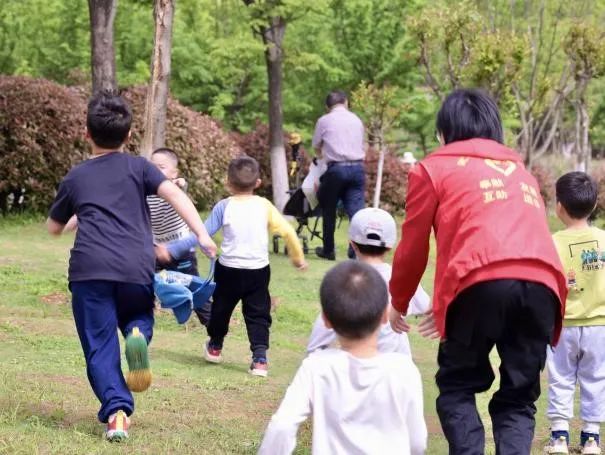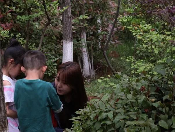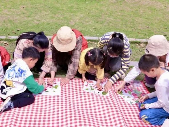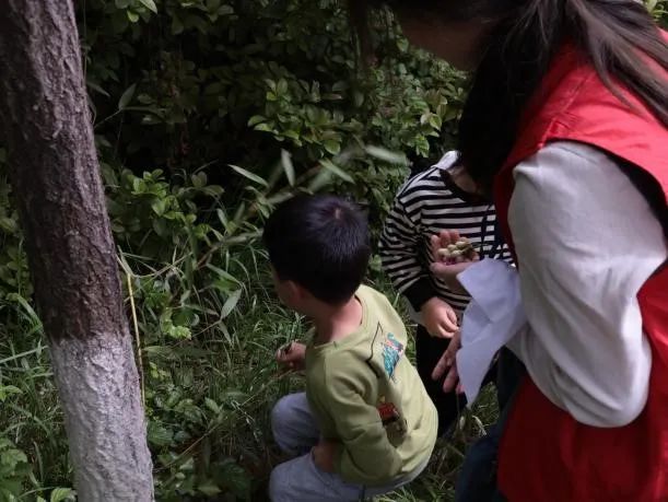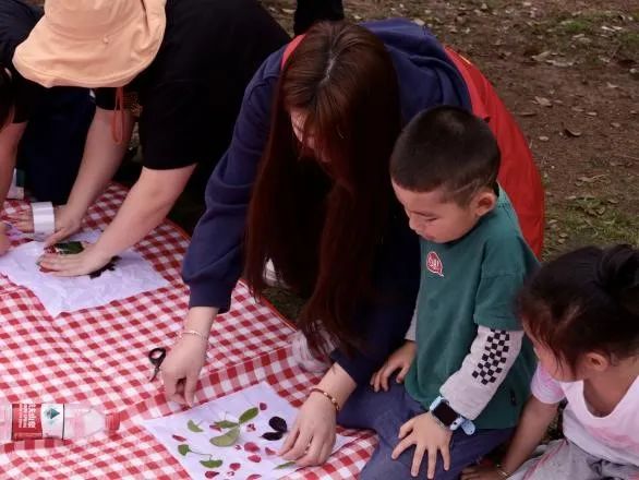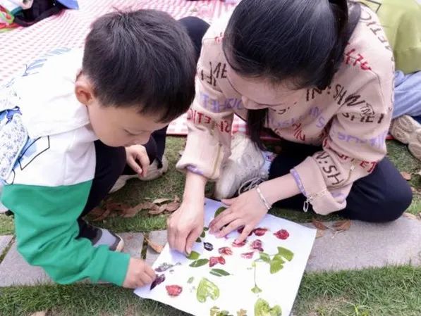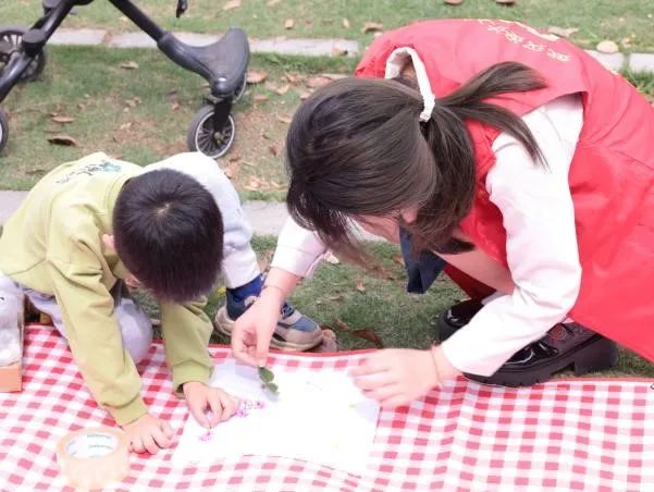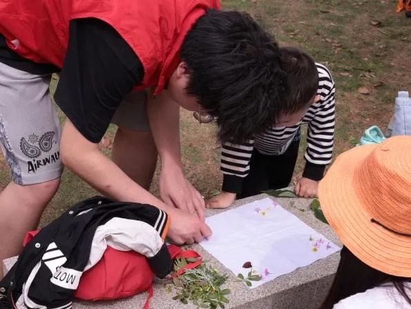 在活动开始后,志愿者小老师和家长带着小朋友们一起在公园内探索自然,寻找自己喜欢的叶子和花朵来制作挂画。