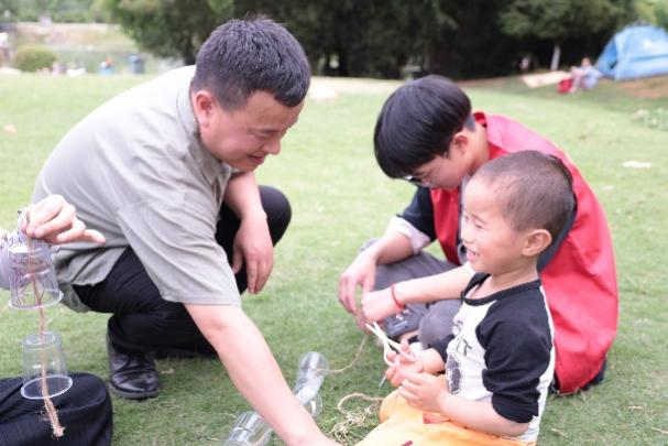 活动开始前,志愿者们为十组家庭准备了材料,在志愿者小老师的讲解和帮助下,孩子们和志愿者们一同寻找喜爱的植物,将自己喜欢的树叶花朵贴在了塑料杯上,然后将杯子打洞用麻绳穿过,这样,一个独一无二只属于自己的风铃就诞生啦。