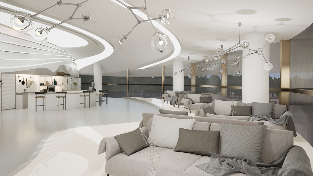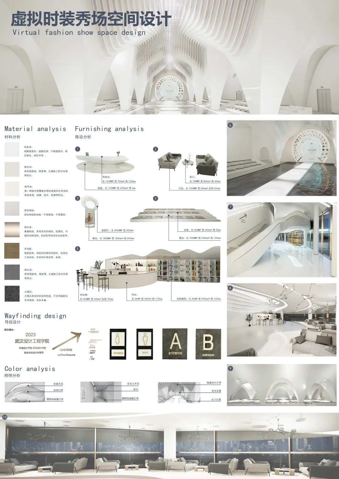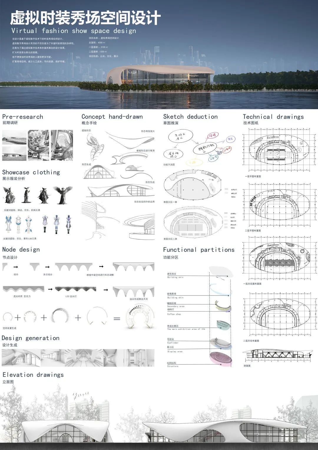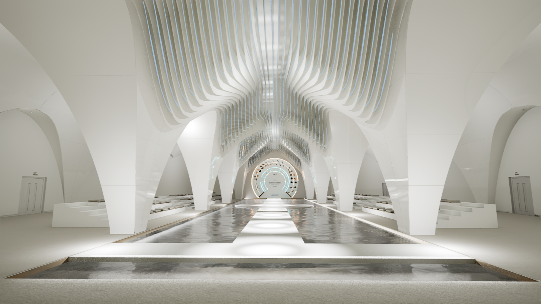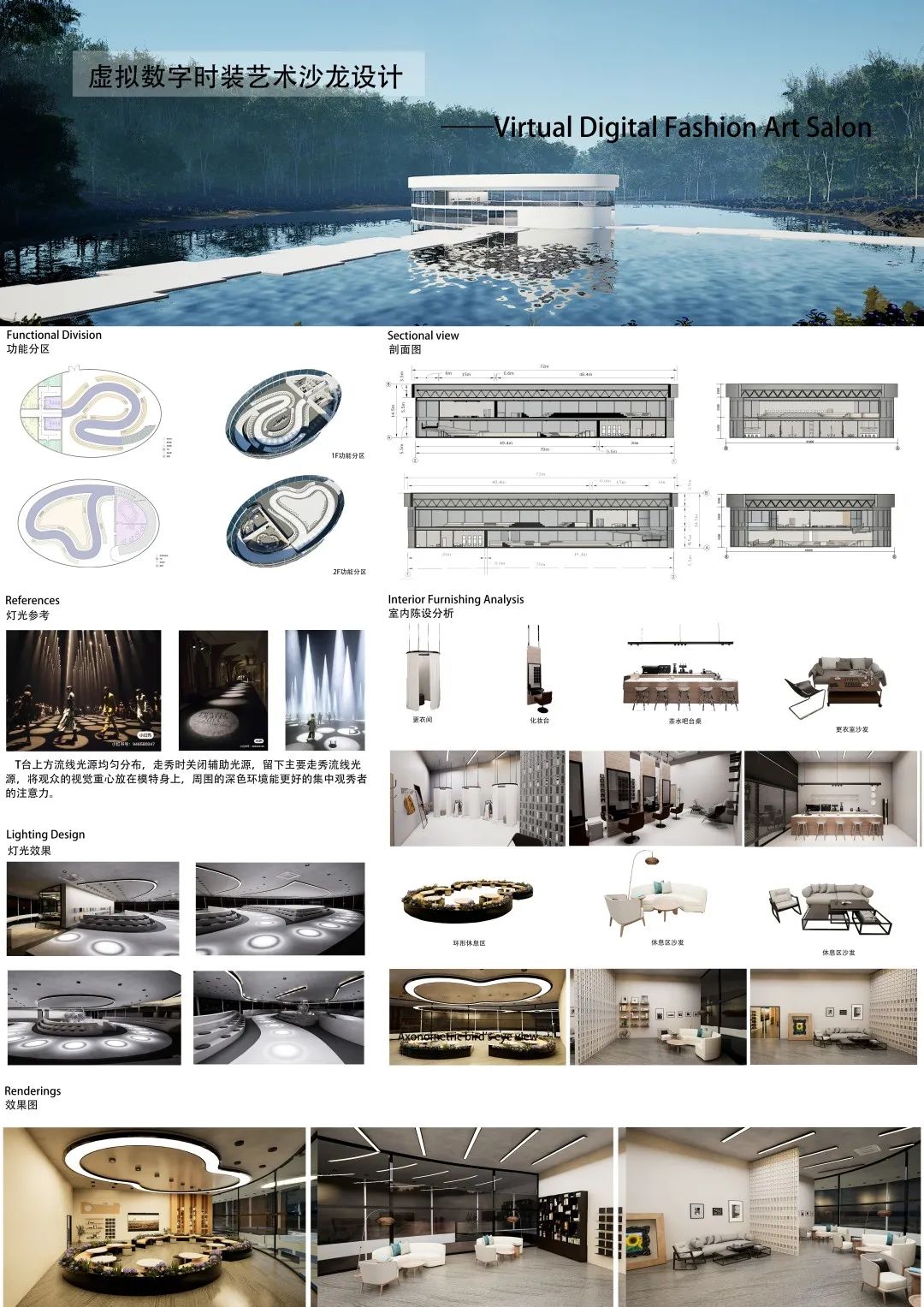 本方案是围绕虚拟数字时装艺术沙龙秀场为主题,与时尚设计学院联合设计,将服装与秀场相结合,以极简的设计风格为主调,在总体布局方面满足后台更衣、化妆、模特休息、观众休息、走秀、观秀的需求。以简洁的曲线线条的T台为主要节点,观众席分布在两侧。