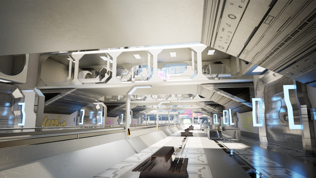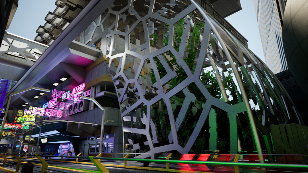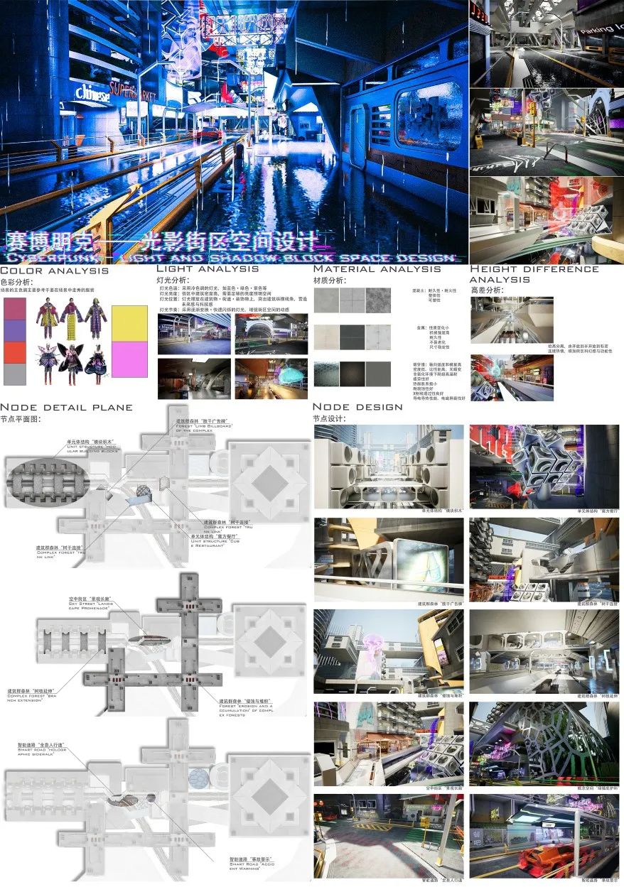 本项目是与服装设计专业的一次联合毕业设计来开展,搭建一个虚拟时装秀场。虚拟数字秀场设计其目的不仅仅是为了丰富时装表现的多样性,还是为了通过虚拟数字技术来丰富其舞台的设计效果,扩大时装受众群众的规模,不便参加时装秀场的人提供更多可能。扩展秀场空间,减少人工成本、节约资源、保护环境。日渐成熟,打开了时装在“后网络时代”的全新表现形式。此项目的最终表达效果则“赛博朋克”风格街区空间服装秀的展览与交互,根据服装中色彩与细节来构建整个街区的整体风格。