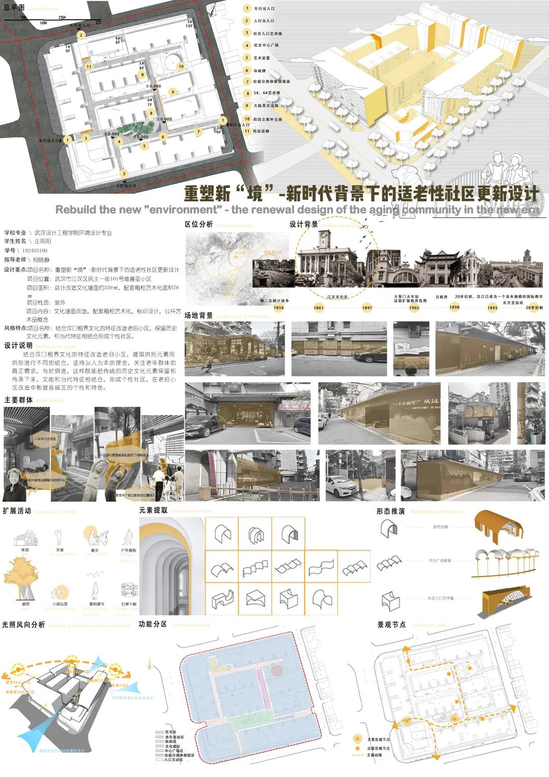 此项目为结合汉口租界文化的特征改造老旧小区,提取拱形元素用拱形进行不同的组合,坚持以人为本的理念,关注老年群体的真正需求,与时俱进,这样既能把传统的历史文化元素保留和传承下来,又能和当代特征相结合,形成个性社区,在老旧小区改造中彰显各城区的个性和特色。
