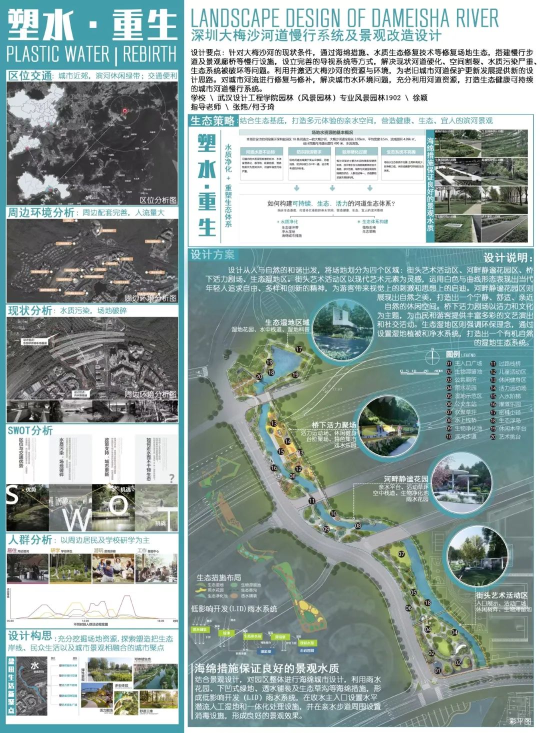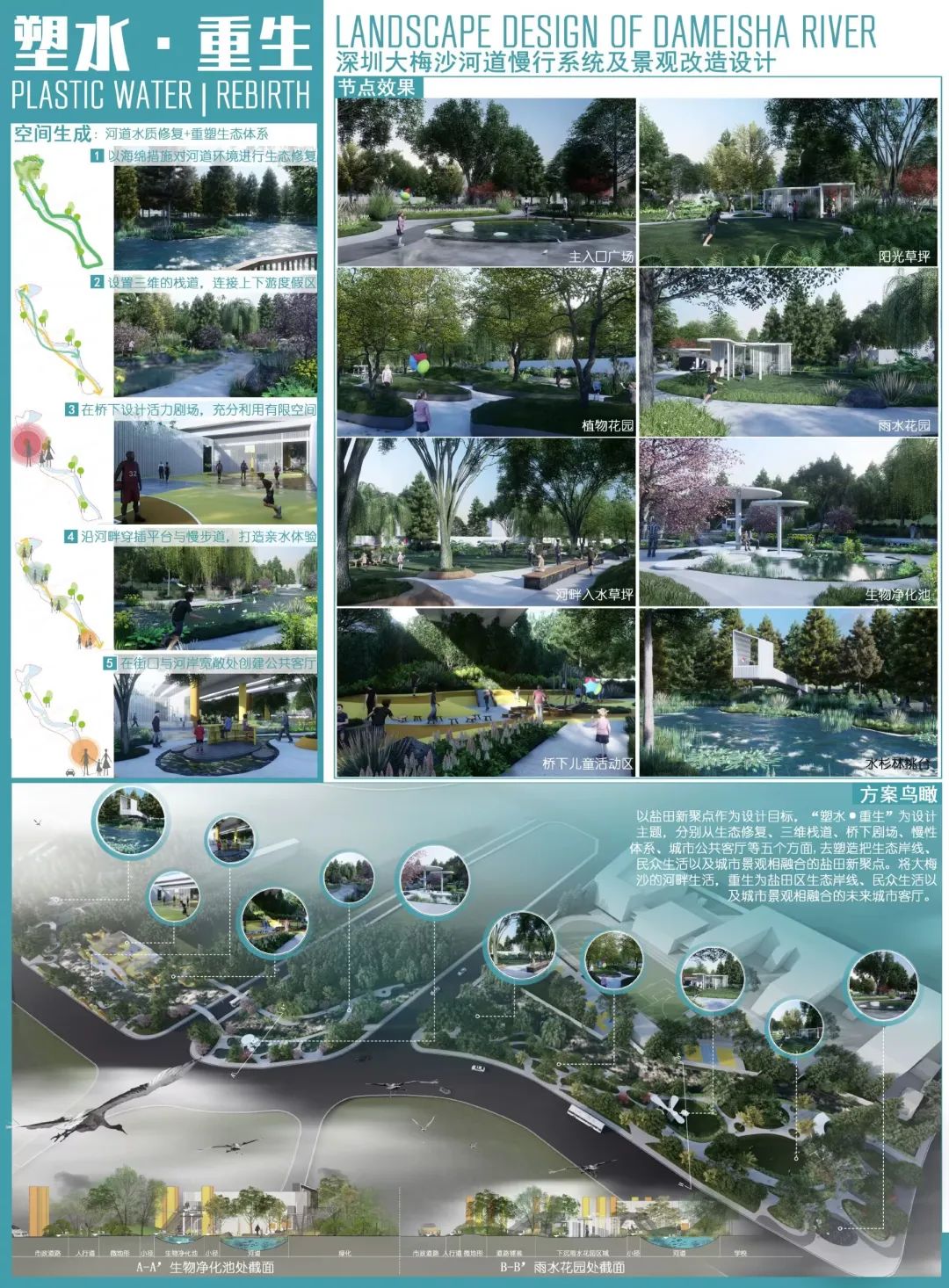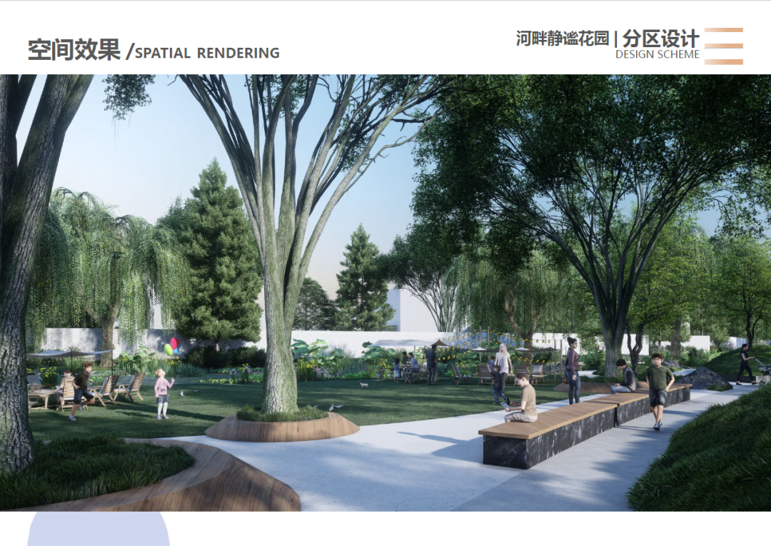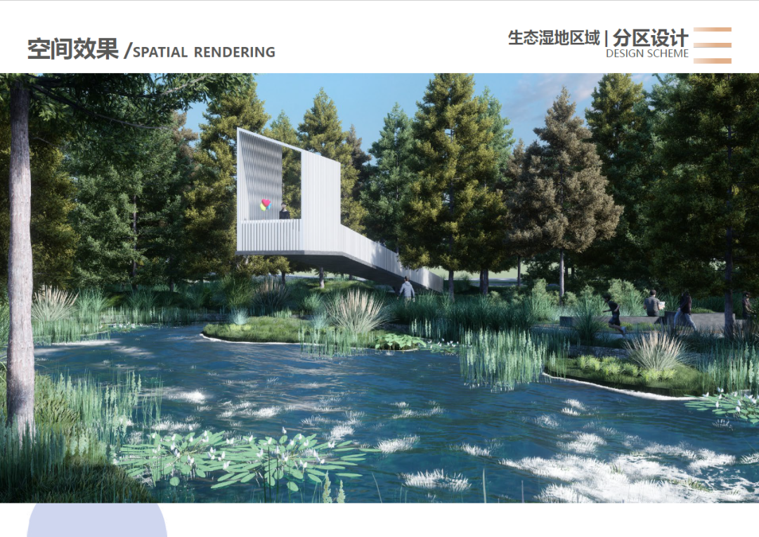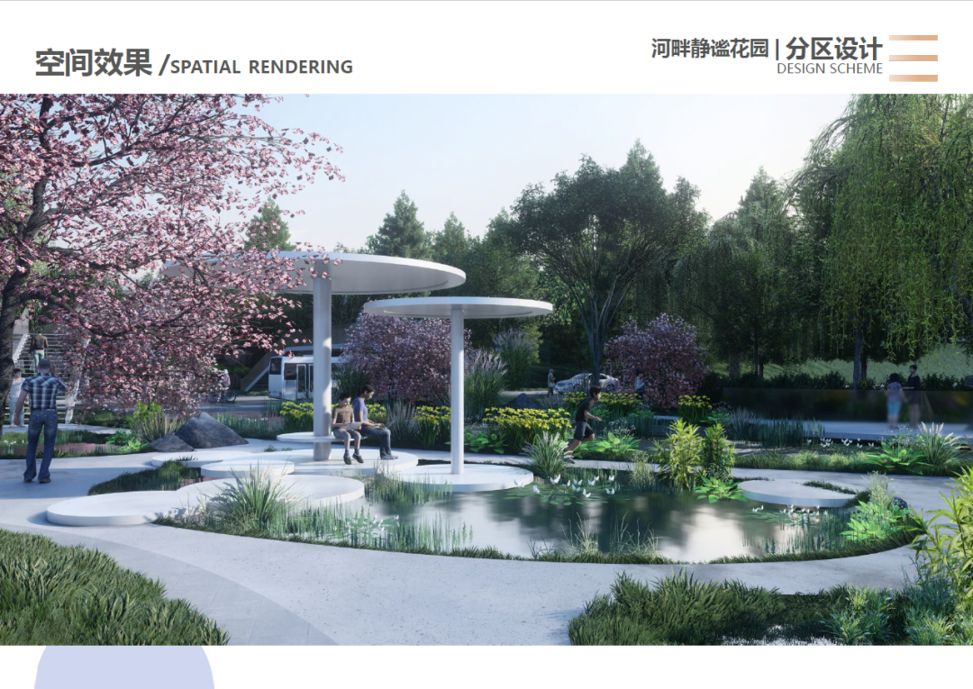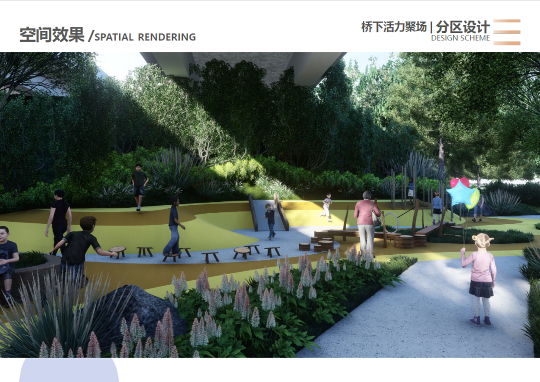 以“塑水·重生”为主题,修复河道水质、充分利用场地资源,将场地划分为四个分区:活力创意的街头艺术活动区、淡雅闲适的河畔静谧花园区、热闹鲜活的桥下活力剧场、自然原生的生态湿地区,打造多元沉浸的景观体验。