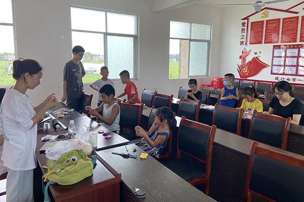 返乡大学生在“留守儿童补习班”教小朋友们做手工