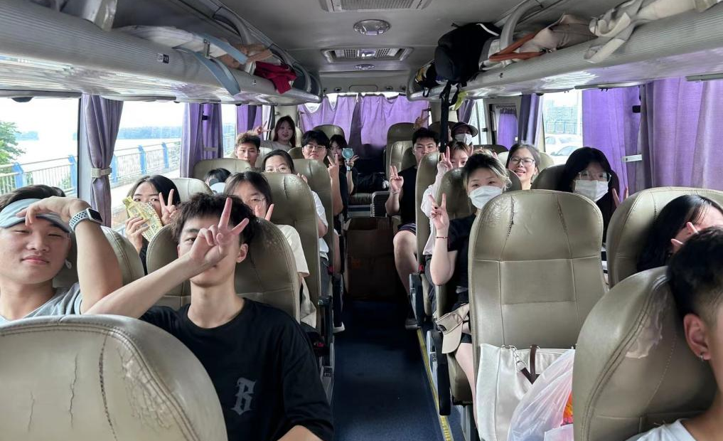 出发前,同学们在车上讨论着如何尽己所能为当地贡献出自己的一份力,每位同学脸上洋溢着笑容,对即将到来的15天社会实践活动充满期待。