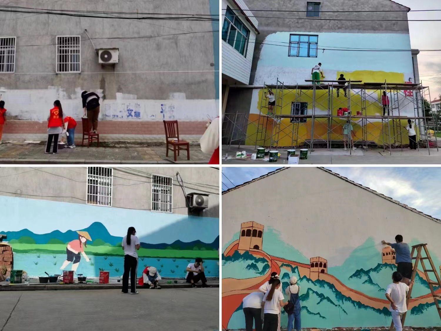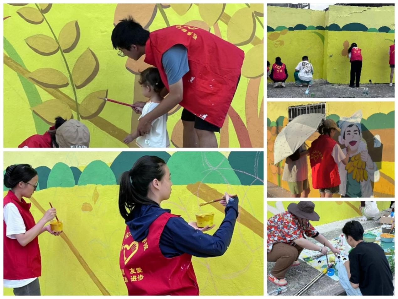 在确定主题后志愿者便开始了色彩之旅,从一开始的设计构图、粉饰墙面、起形打稿再到上色填色、勾勒细节。从“插秧”再到“丰收”一幅幅画卷跃然于墙头。实践团成员在本次社会实践中充分发挥不怕吃苦、勇于担当的精神。