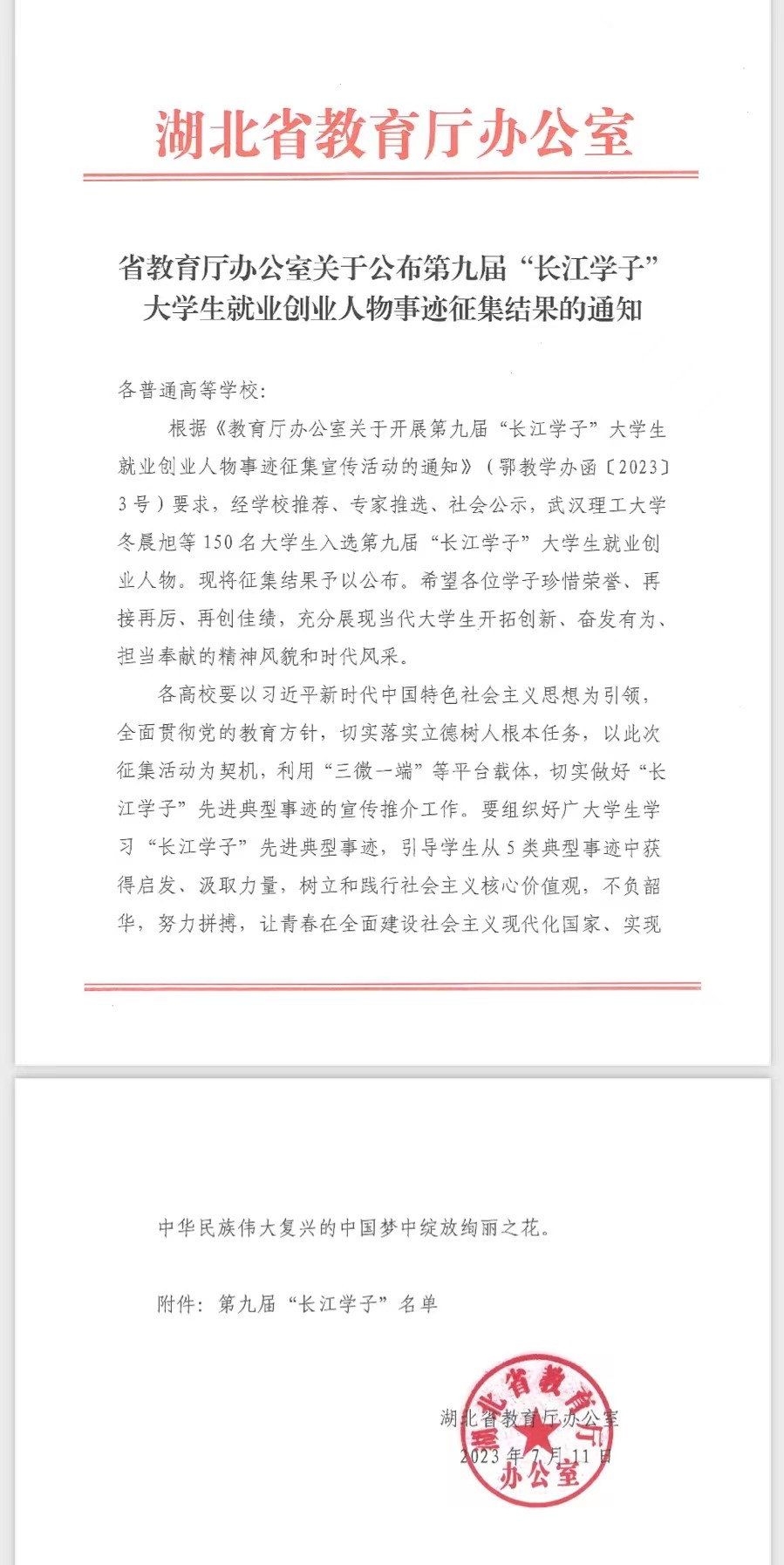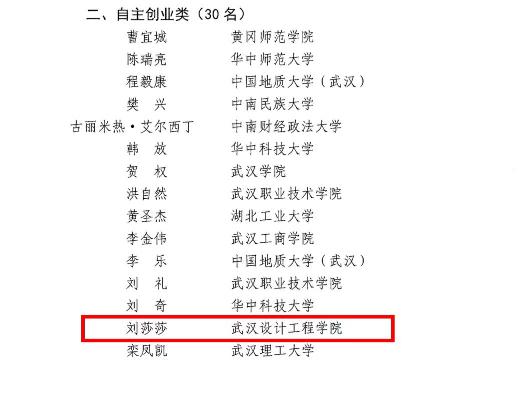 近日,湖北省教育厅办公室公布《第九届 “长江学子”大学生就业创业人物事迹征集结果的通知》,经学校推荐、专家推选、社会公示,150名大学生入选第九届“长江学子” 大学生就业创业人物。我院学子刘莎莎获评湖北省第九届“长江学子”大学生就业创业人物(自主创业类)。