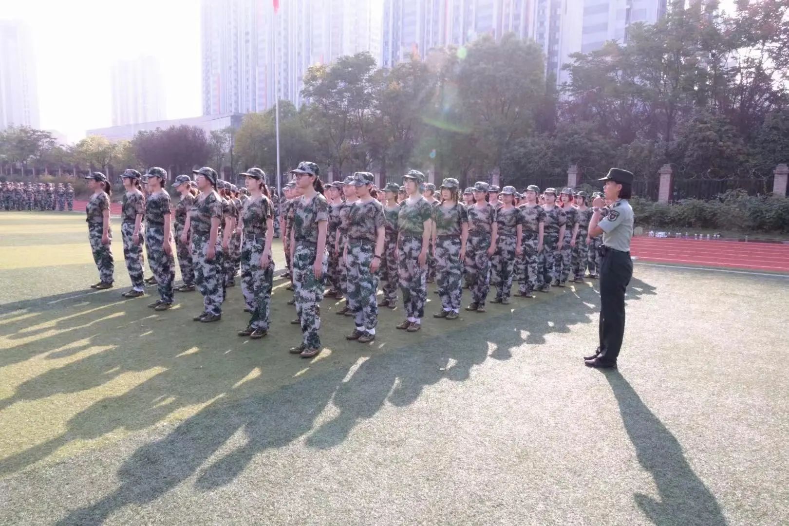 “稍息!立正!”“向左转!向右转!”整齐的队伍,一致的衣着,铿锵有力的口号,少年们神采奕奕,展现出环设学子的青春风采。第一天或许很疲惫,但这一切融进蔚蓝的天空和开阔的操场里,却显得那么热烈!