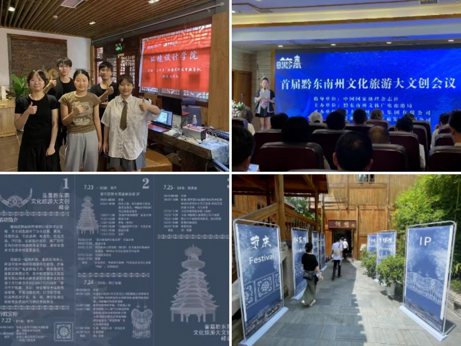 实践队员们首先抵达了贵州省黔东南黎平县肇兴侗寨,进行了团队的第一个项目。第一个项目是参与首届黔东南州文化旅游大文创峰会前期的海报、展板、手册、ppt等相关设计。黔东南地区以其独特的少数民族文化而闻名,在到达目的地前,队员们便对当地的文化特色进行了初步分析,并进行了设计分工。后期通过实地走访考察肇兴侗寨景区,团队最终融合了“鼓楼”、“银饰”、“蜡染”、“木质材料”等极具当地特色的元素,并将现代元素巧妙地融入其中,完成了独特富有黔东南特色的设计,展现了少数民族文化与时代的融合之美。