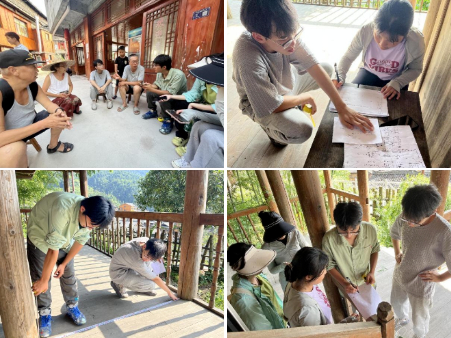 大文创峰会结束后,团队成员们来到了海拔800米的堂安博物馆,进行了实地考察、测量与场地制图。堂安博物馆属于典型的侗族建筑,采用自然材料如木材、竹子等,既符合生态环保的理念,又能够适应湿润的山区气候且侗寨木质建筑通常采用坡屋顶设计,侧面倾斜,起到有效排水、保护建筑的作用。屋顶采用木瓦或板瓦作为覆盖材料,具有防水防火的特点。随后队员们利用无人机对博物馆的整体轮廓与周边地形进行了图像采集并绘制成图。回程途中,队员们通过走访堂安的民间文化纪录者张老师,得知了他十几年前来贵州奇幻又浪漫的爱情故事,机缘巧合下扎根于贵州,现在仍坚守着自己的梦想并为当地民族文化做宣传与记录。队员们也希望以张老师人物故事为引,将黔东南民族传统文化融入其中,使博物馆经设计改造后能拥有独特的风格。