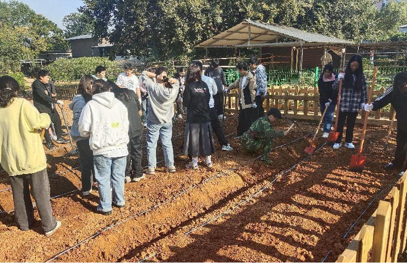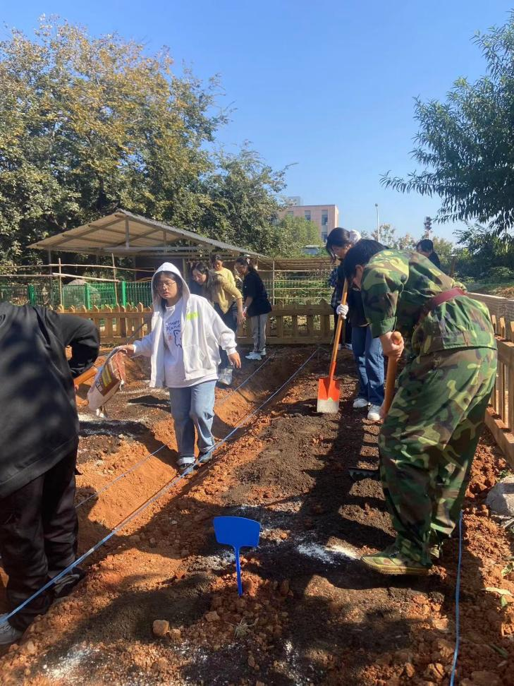 翻土犁地是花房劳动实践的开篇之作。同学们此次任务需为花苗种植开拓排水沟、平整结块土地、在原土地上均匀加入营养土。在专业教师的示范指导下,同学们手握铁锹,翻动土壤,以小组为单位纷纷投入到这项富有挑战性的任务中。