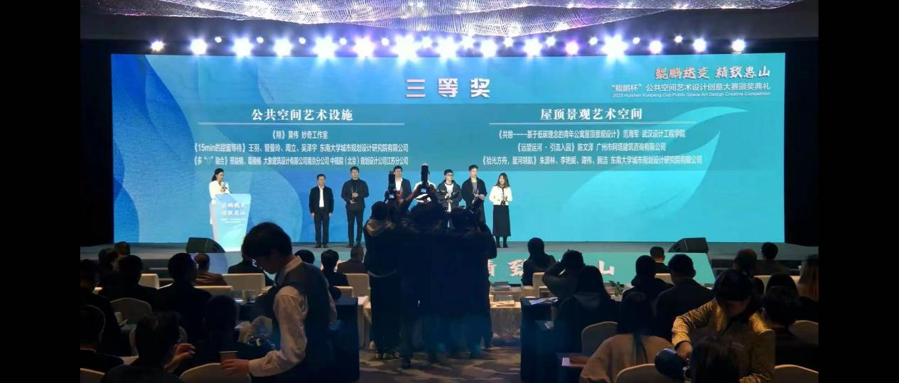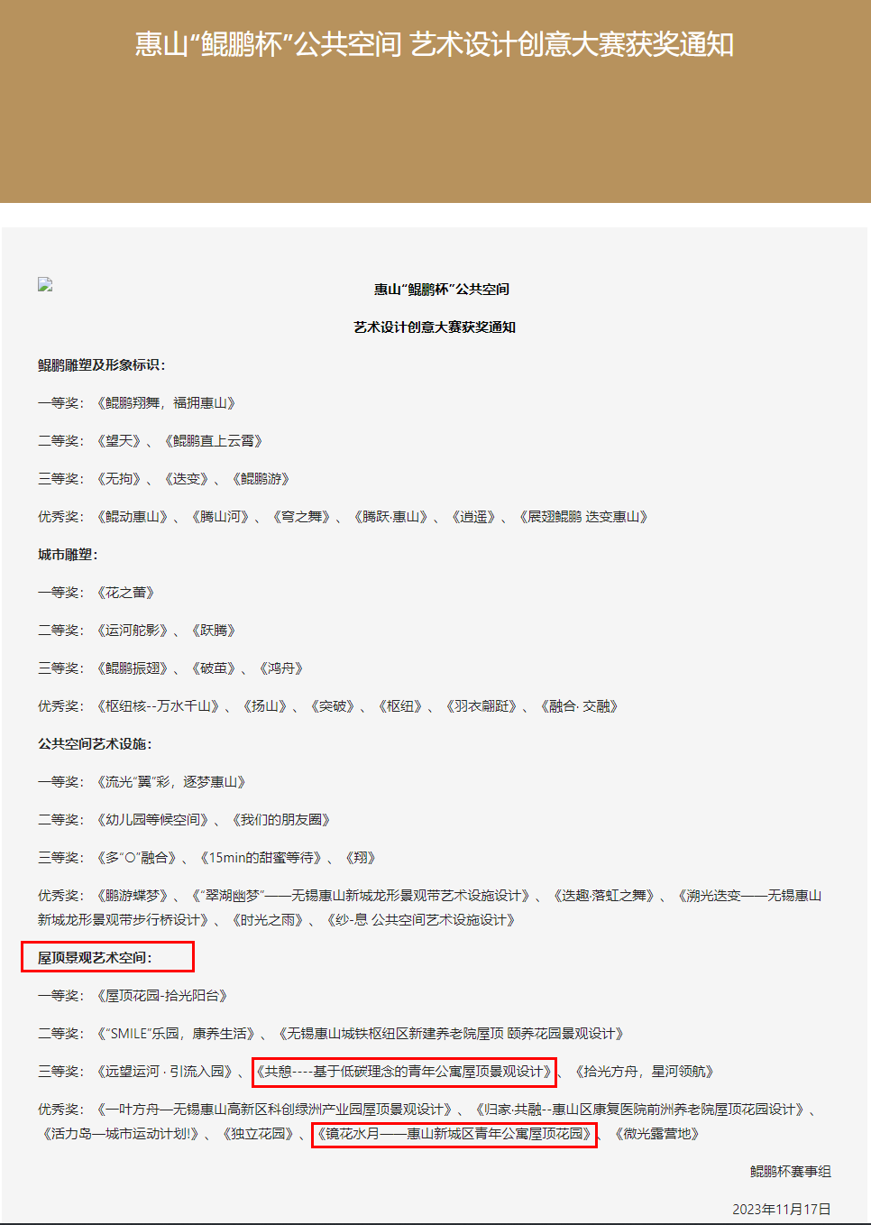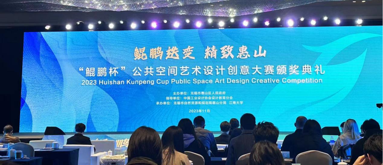 2023年11月25日,惠山“鲲鹏杯”公共空间艺术设计创意大赛的终评在无锡举行,范海军、罗谷昊两位同学前往现场领奖。