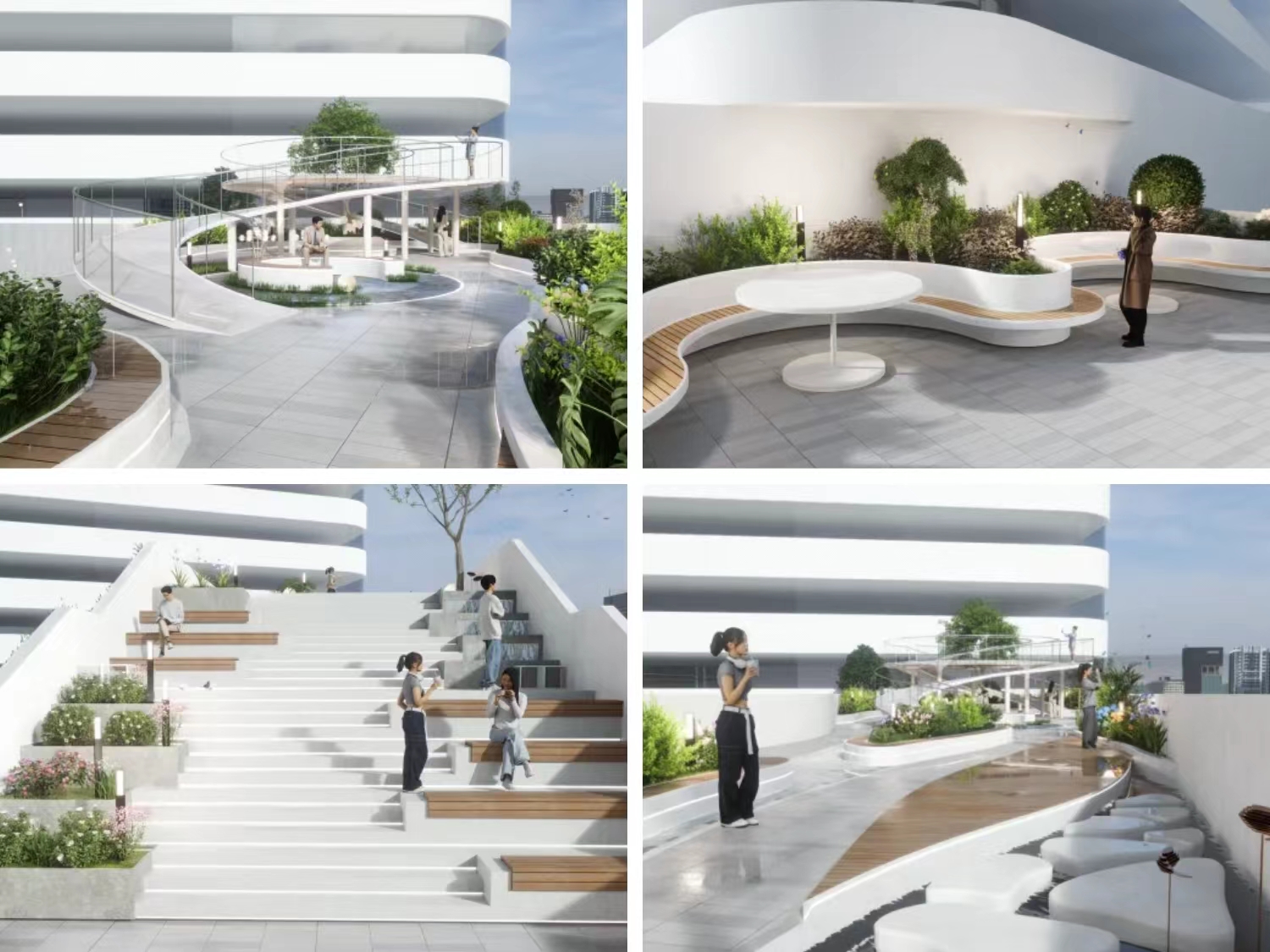此项目位于江苏省无锡市惠山堰桥镇。设计对象为青年公寓商业配套区1-2层屋顶,占地面积为767.3㎡。本案设计的目标是打造一个青年人喜欢居住的、环保低碳的公寓环境,其中屋顶花园是整个设计中最具特色的一部分。通过屋顶花园的设计,可以有效地提高公寓的绿化覆盖率,增强自然气息,同时也能改善公寓内部的微气候,实现节能减排。在屋顶花园中,设置了雨水收集系统,这个系统可以将雨水收集起来,用于植物的灌溉和景观用水。这样可以减少对公寓水源的消耗,水资源的再利用。本设计的亮点在于将低碳理念与艺术装置、绿色植物等元素相结合屋顶花园。通过这种方式,本案希望能够引起人们对环保和低碳生活的关注,同时也为青年人提供一个宜居的生活环境,这种设计不仅能改善公寓的整体环境质量,还能为城市的可持续发展做出贡献。