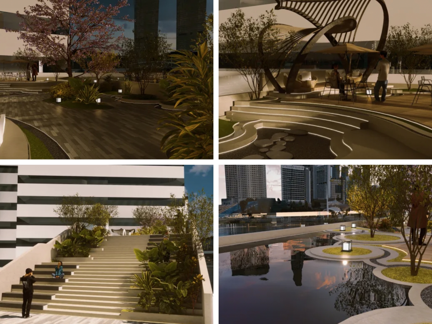 设计中水景灵感来源于泰国芭提雅希尔顿酒店的空中花园,因而在规划好交通流线及道路尺度后便以该酒店花园的的样式作为参考借鉴;该设计最初的形式还是以本人习惯的简约风的直线条为主,但考虑到受众群体长时间在冰冷的条条框框里工作生活棱角分明的直线会让其感到压抑,因而采用弧形的方式来形成功能分区,并将铺装进行简化处理,使人在感官上感到放松休闲,该设计以镜、花、水、月四个字为主题,将雨水进行收集利用,与景观相融合达到“水景及水镜”的效果,植物选品也用了许多观花乔木使白天的镜与花,夜晚的水与月相呼应。