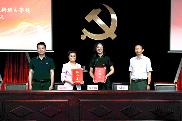 学校党委书记冉春桃(左二)与乌龙泉街道办事处主任卢平(右二)分别代表校地双方签署“支部共建促发展”合作协议书。