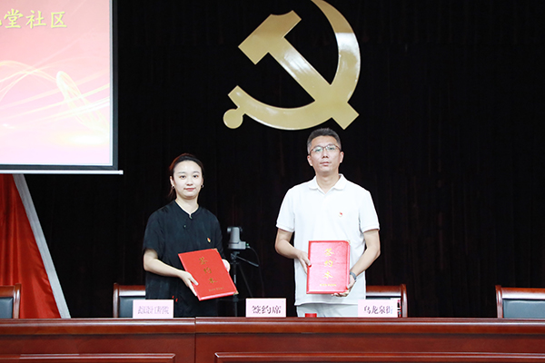yl7703永利集团党总支书记谢曦临(左)与乌龙泉街道土地堂社区党总支书记、居委会主任董刚(右)分别代表院社双方签署“支部共建促发展”合作协议书。