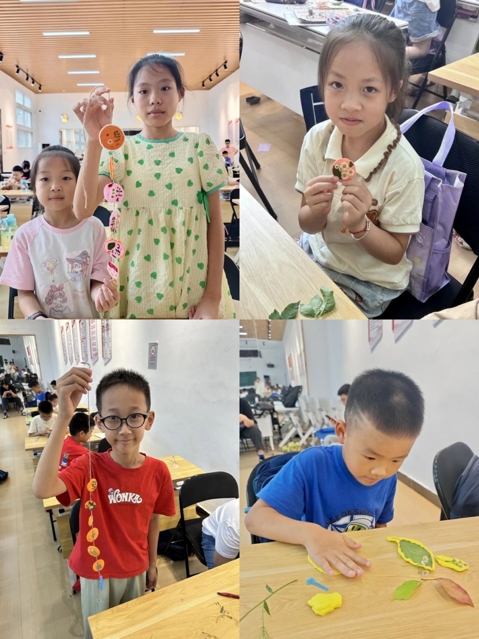 黏土风铃课上,志愿者们化身为技艺高超的导师,引领着孩子们踏入了一场黏土与植物交织的梦幻之旅。孩子们发挥无限想象,将五彩斑斓的黏土塑造成各式各样的形状,再将花朵、绿叶嵌入柔软的黏土中,创造出独一无二的纹理和图案,再巧妙地串联成风铃。随着指尖的跳跃,一个个独一无二、充满童趣的风铃逐渐成形,有的作品展现了春天的生机勃勃、有的则充满了秋日的宁静与祥和,它们不仅装点了教室,更在孩子们心中种下了对美的追求与向往。