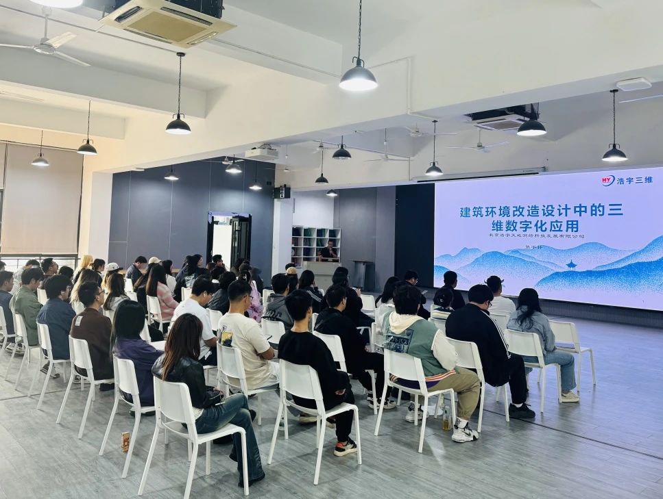 接着由北京浩宇天地测绘科技发展有限公司的技术人员张宇轩为同学们介绍了新技术、新产品以及新应用在环境设计当中的应用。从基础数据全面获取、辅助调研诊断和决策、确立改造实施方案、实施改造成本核算、运营维护提供数据支撑等五个方面展开讲述,展示了如何通过三维数字化技术精确呈现建筑环境的实时状态。该技术不仅提升了设计精度,也让环境改造的可视化与管理更具智能化,助力高效设计与精准决策。使同学们更加了解了三维数字化在建筑环境设计中如何开展及应用。