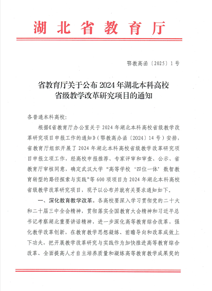 12月25日,省教育厅发布2024年湖北本科高校省级教学改革研究项目,我院《深度融合行业背景下的环境设计专业应用型数字化教学研究》项目成功获批。