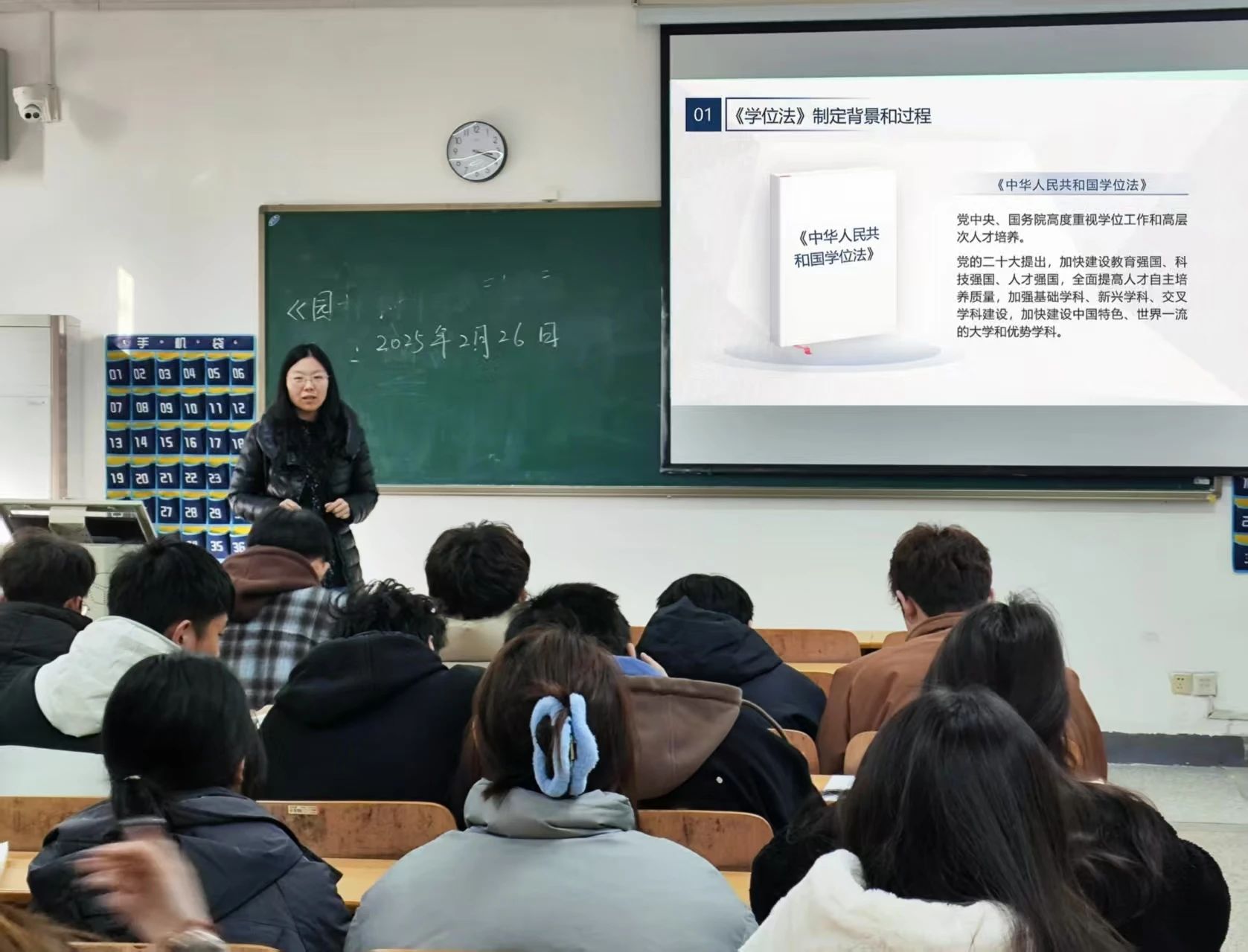 开学初期,辅导员及班主任,以班级为单位组织全院各班级开展《学位法》学习,深入解读《学位法》的核心要义。围绕学位授予条件、学术规范要求、学位争议处理等重点内容展开系统学习,并结合专业特色与实际,引导学生深刻认识《学位法》对保障学术质量、维护学术诚信的重要意义。