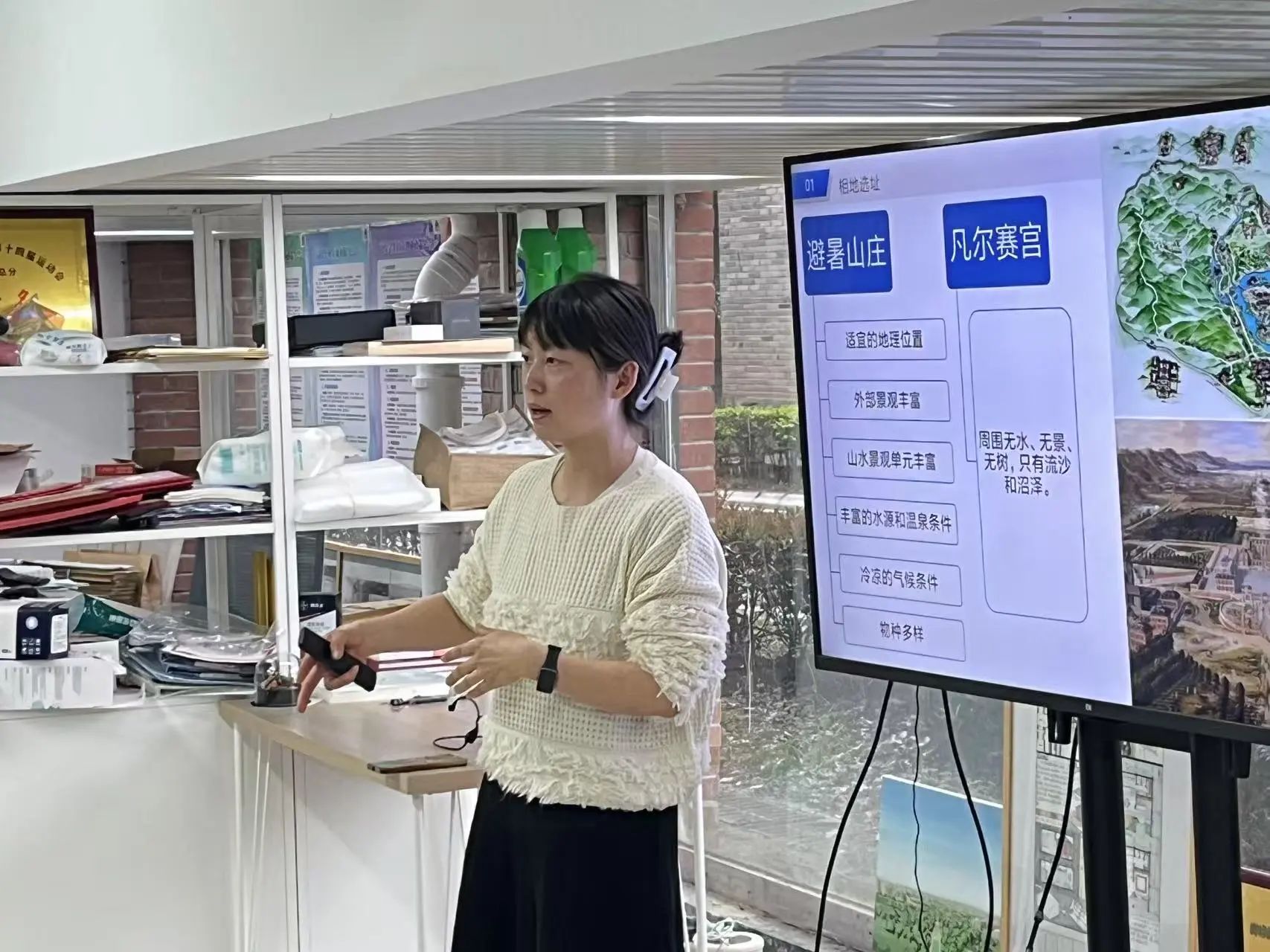 分享会伊始,吴老师以“避暑山庄”和“凡尔赛宫”为典型代表,深入剖析了两者的历史背景、建造缘由及选址考量。随后,她详细解读了这两座园林的布局结构。吴老师指出,“”避暑山庄”的布局通过叠山理水、借景造境,将自然景观浓缩于园林之中,展现了中国传统皇家园林“以小见大”的营造智慧。在水源分析环节,她着重讲解了避暑山庄的“一池三山”结构,并结合地势分层的方法,指导同学们如何利用岛、堤、桥划分出丰富多样的山水空间,体现了传统园林因地制宜、与自然共生的设计理念。