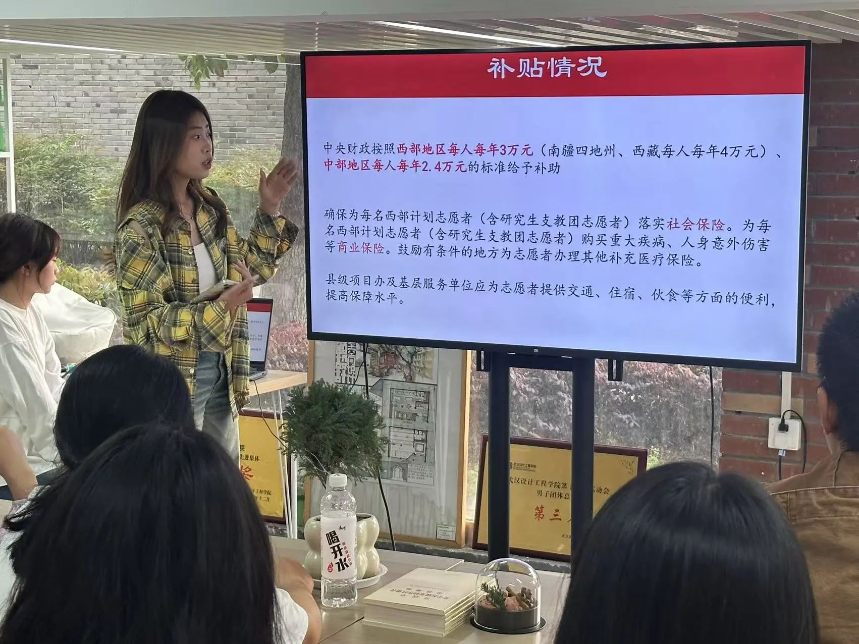校青年志愿者协会(校青协)志愿者担任主讲,围绕西部计划政策、服务内容、报名流程及往届经验展开讲解。现场通过ppt展示西部基层风貌,分享志愿者扎根乡村教育、生态保护的真实故事。互动环节中,学生就服务地区分配、待遇保障等提问,主讲人结合政策文件细致解答。