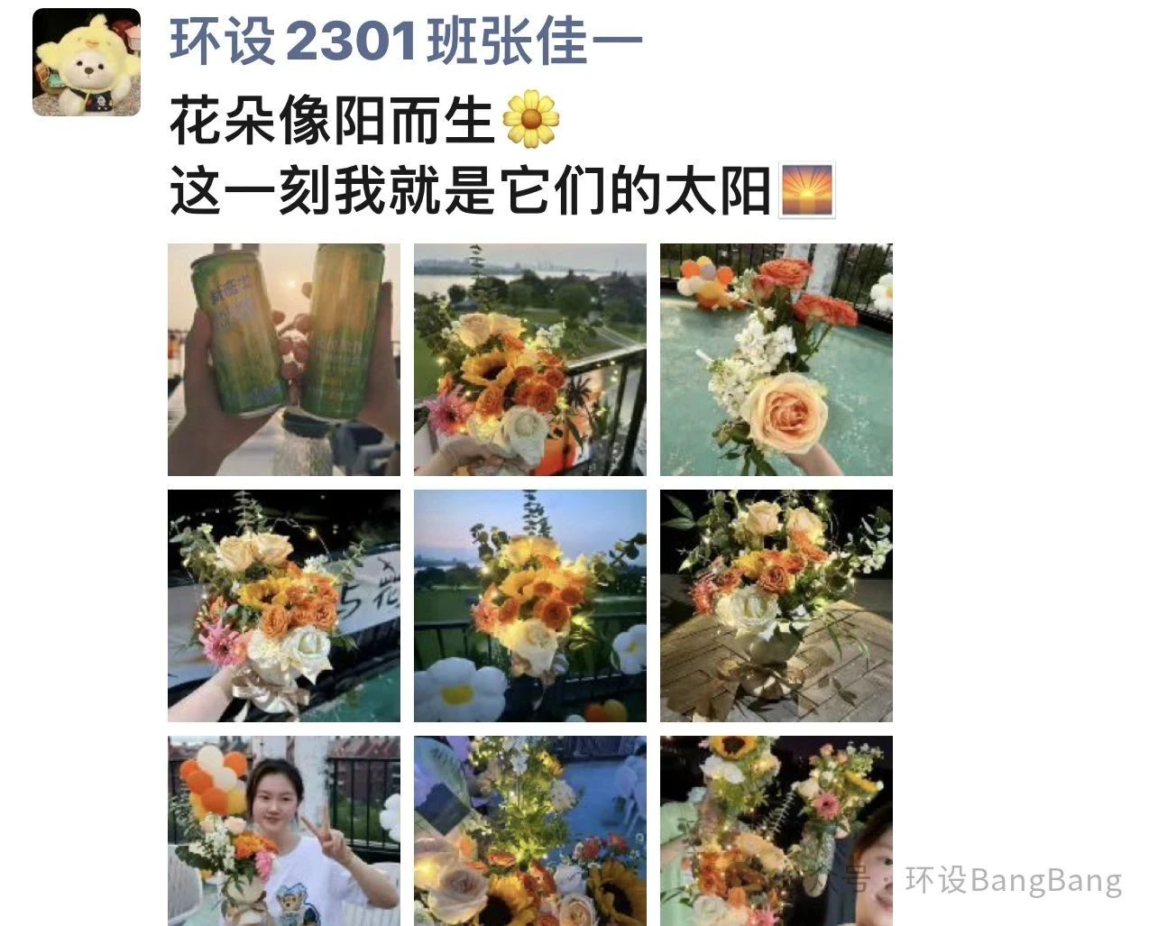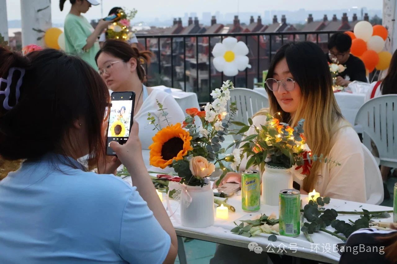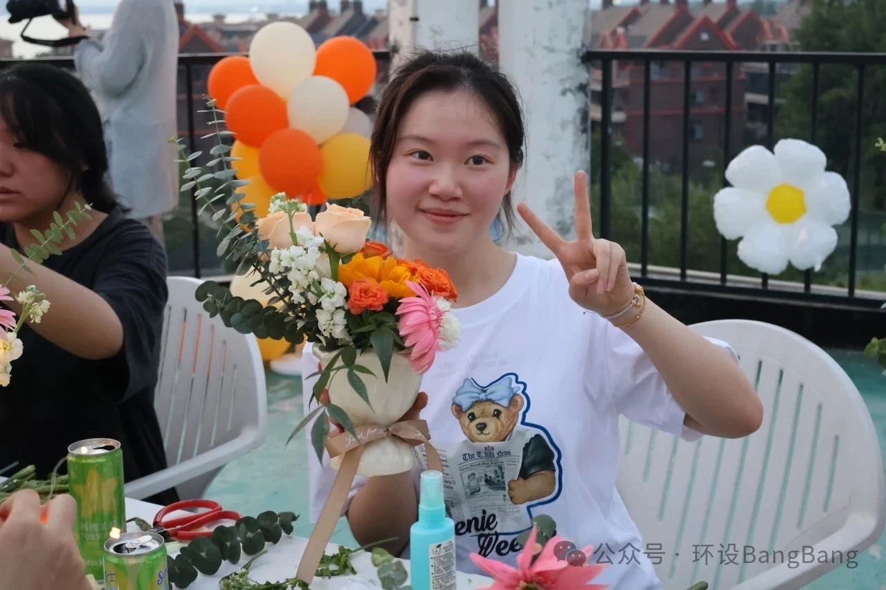 晚风送来旋律,落日歌会的即兴合唱中,同学们尽情释放自己。这场持续两个小时的活动,让同学们带回的不仅是花艺作品,还有对可持续生活的思考、专业知识的具象化实践,以及一次坦诚的情绪对话。正如活动结束后仍在天台打卡拍照的同学所说:“花朵向阳而生,这一刻我就是它们的太阳。”