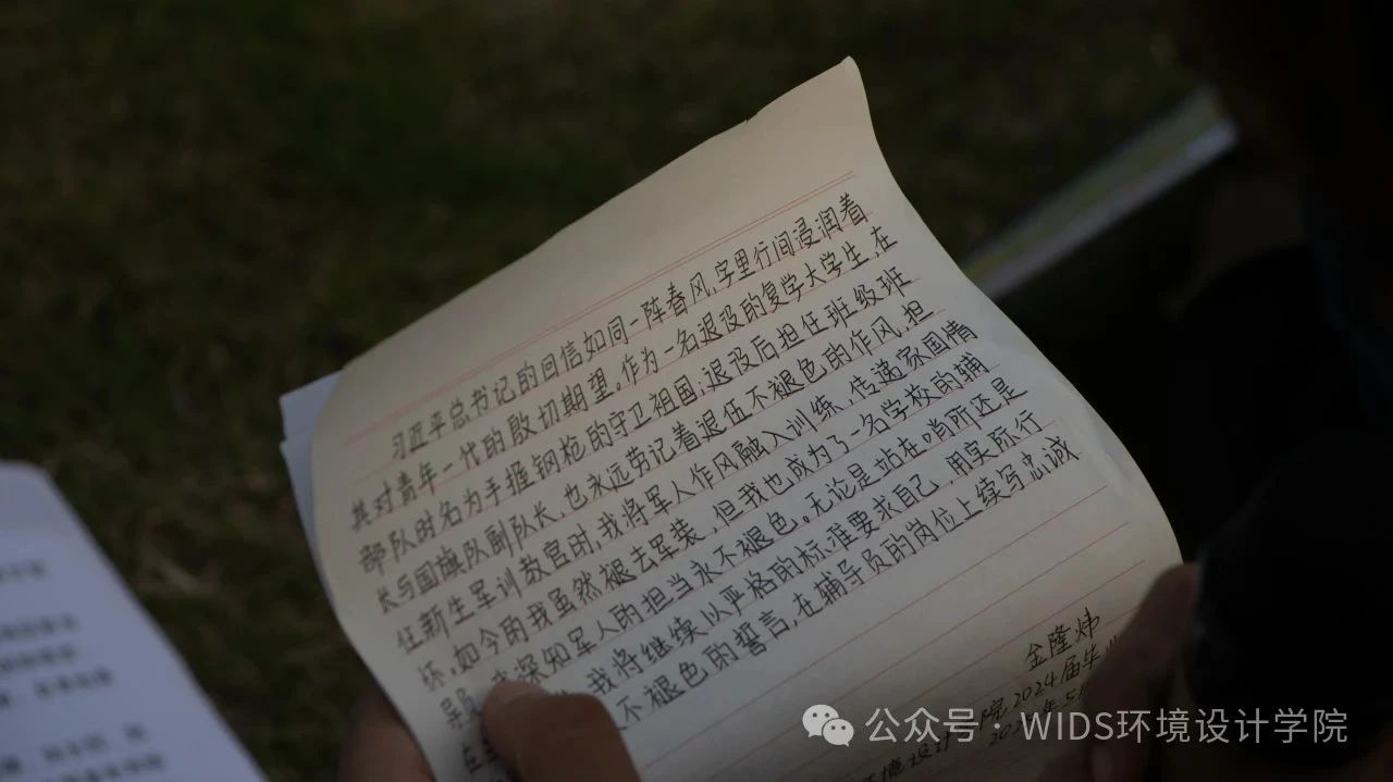 随后,各专业大一新生代表手持亲笔写就的“致未来信件”,表达了对回信精神的感悟,以青春之声向未来许下庄严承诺。环境设计2402班黄邓希目光坚定,高声诵读:“希望自己能在未来的学习中不断提升专业技能,用设计为基层地区带来更多美好的改变——让每一寸土地都镌刻青年设计的温度,让每一次创作都成为乡村振兴的注脚。”