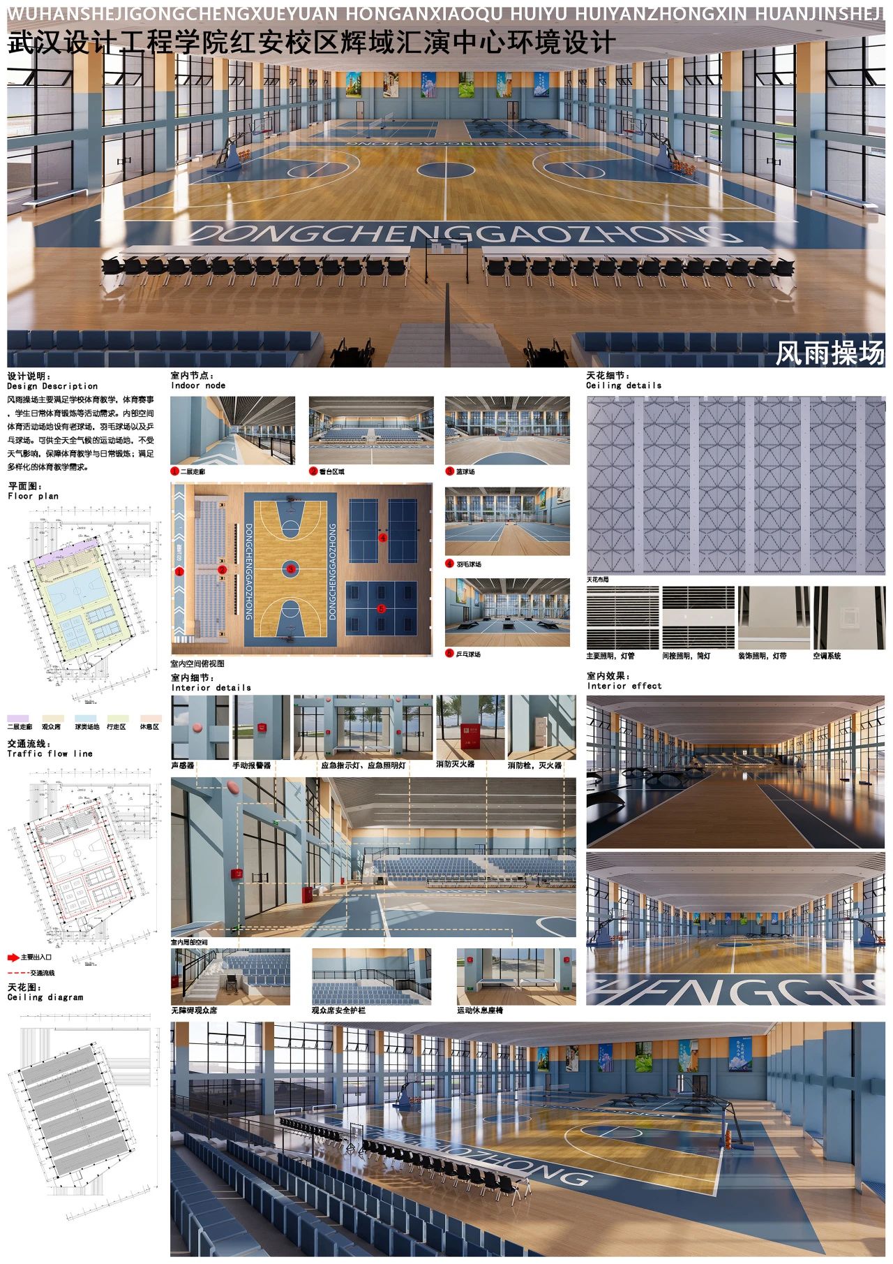 yl7703永利集团红安校区辉域汇演中心为风雨操场环境设计项目,建筑外部空间设计构建日光与夜景交织的全时态校园环境,为校园注入青春活力。以“辉域”为空间主题,融合光学美学设计,塑造三种场景功能下的环境营造方案:风雨操场配备专业运动场地,满足体育教学与赛事需求,运用自然光线与夜间照明校内室内运动场,赋予场所青春昂扬的蓝色和木质色元素视觉感受;汇演空间注重声学、光感视觉优化舞台布局,营造沉浸式视听效果;展示交流空间则通过开放式布局与数字多媒体互动交流区,激发展示创意交流。整体设计简约明亮,兼顾实用性与艺术性,为校园打造集体育、演艺、展示交流的功能需求,成为校园文化新地标。