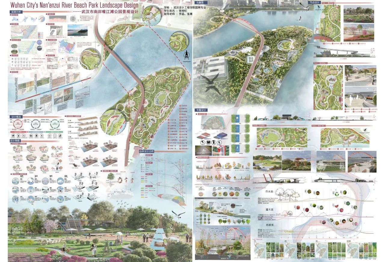 南岸嘴位于湖北省武汉市汉阳区的晴川阁附近,与中国最长的河流长江和长江最大的支流汉江相邻,南岸嘴区域是两江交汇处形成的冲击地带。南岸嘴江滩公园面积约40公顷,陆地面积占地18.6公顷,与长江、汉江联系紧密,景观条件良好。设计以生态作为背景,结合长江、汉江水系文化,武汉三镇本土特色,生态护坡驳岸建造为要点,同时加强与其他部分之间的联系。利用绿地空间、滨水慢行系统、铺装改造等有机结合打造成一个生态友好、沟通两岸、协调环境、净化水体和服务居民的生态友好型公园。