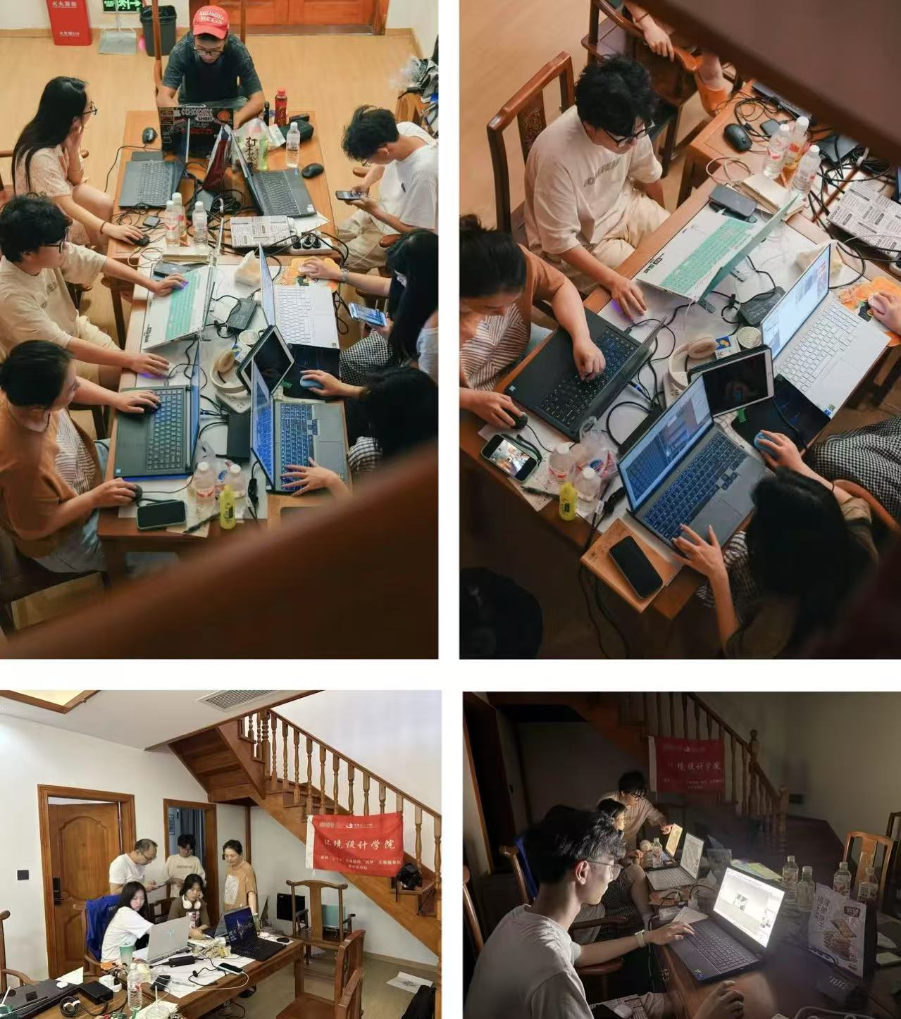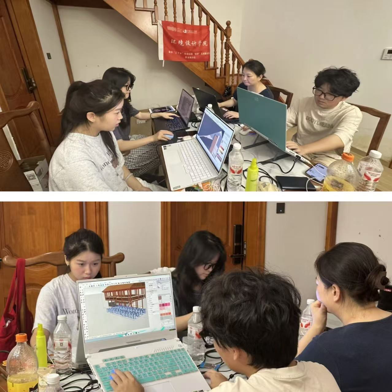 再次回到工作地,团队成员全身心投入到设计方案的完善工作中,结合补全的精准数据,对之前的方案雏形进行细致调整。针对生态博物馆的展陈空间,队员们进一步优化了设计。窗外的阳光从刺眼变得柔和,又渐渐褪去,工作地的灯光亮了起来,照亮了团队成员的脸庞。截至傍晚,设计方案在不断的推敲和完善中愈发成熟,每一个细节都更加贴合侗寨的实际情况和文化传承需求,距离“让现代设计激活传统村落文化基因”的目标又近了一步。