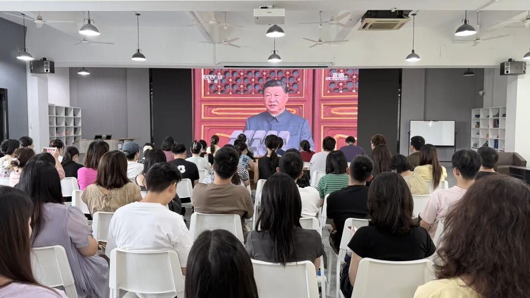 教职工们齐聚学院会议室,怀着激动的心情,共同观看阅兵盛况,现场气氛庄重而热烈。