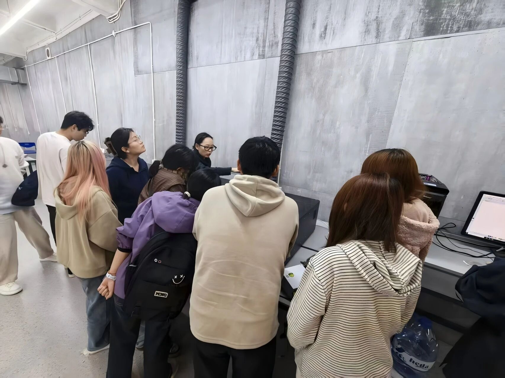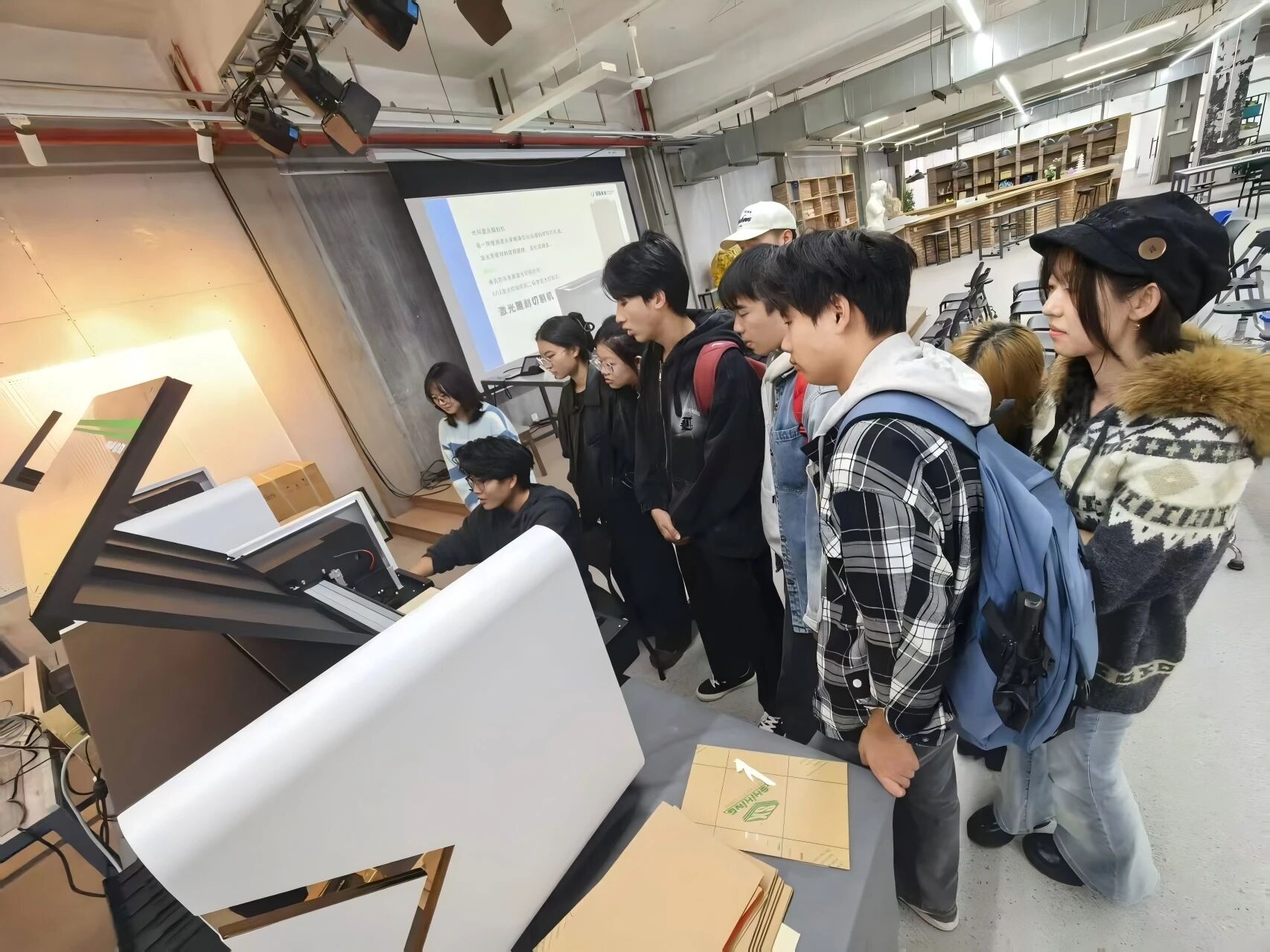 随后,在模型制作实验室,蓝鲸未来科技有限公司的实验员以“从图纸到成品,一堂课看懂激光切割”为题,为同学们带来了一场“干货”满满的现场教学。演示间隙,实验员还拿出公司“激光创业平台”的公开数据:平台已为218个校园创客团队提供“前店后厂”式服务——学生在线上传图纸,系统自动报价、排产,成为大学生创业的标杆案例。听完介绍,同学们把实验员团团围住,有的咨询如何运用平台进行创业,有的追问“激光切割+亚克力灯带”能否落地毕业设计,现场气氛热烈。
