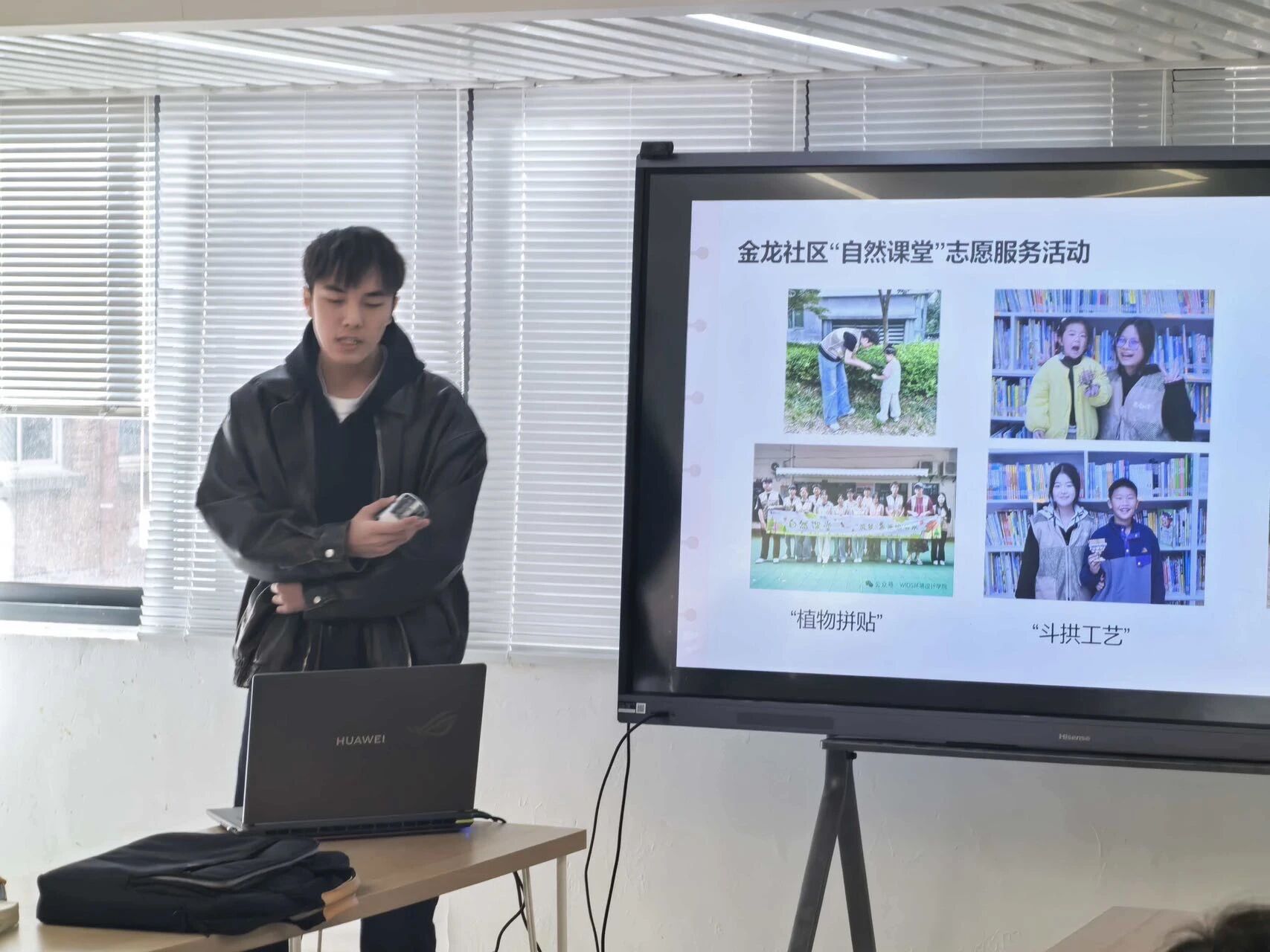 在分享会上,万俊男同学首先介绍了“筑梦”志愿服务队的初心——依托学院筑巢工程和艺术技能特色,确立“美育+志愿”的核心方向,打造了“自然课堂”等品牌项目。他提到,“筑”呼应环境设计、风景园林专业的建造内涵,“梦”则承载着用艺术点亮孩子童年的心愿,服务队希望通过引导孩子们用感官感知自然、用双手创造艺术,在心底播撒可持续发展的理念种子。