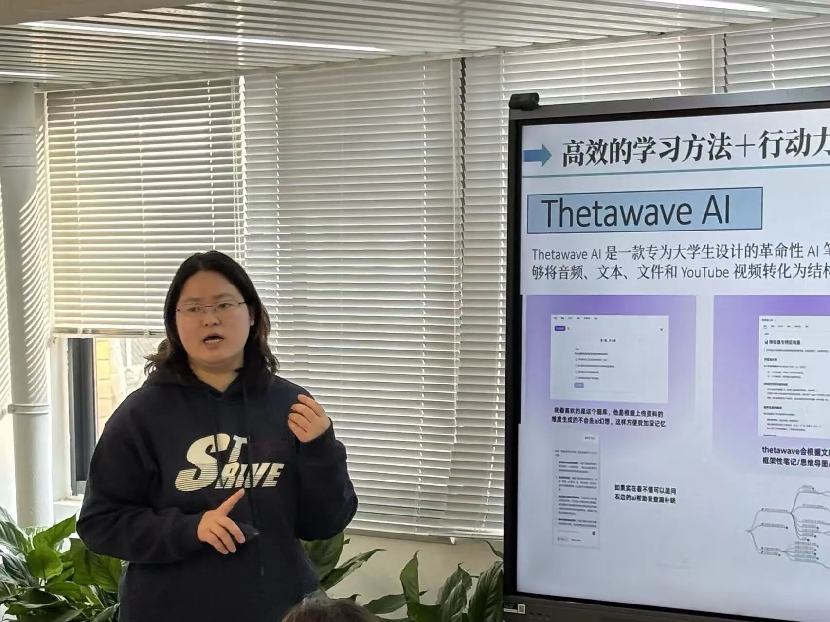 临近期末,陈梦婷还贴心地推荐了一款宝藏学习工具——Thetawave AI。这款专为大学生设计的智能笔记工具,能够将纸质资料、音频、文本甚至视频内容,转化为结构清晰的笔记、思维导图、Flash闪卡及个性化题库,助力大家高效复习、从容应考。她也鼓励同学们主动探索各类AI工具,让科技为学习和工作赋能,真正实现“事半功倍”。