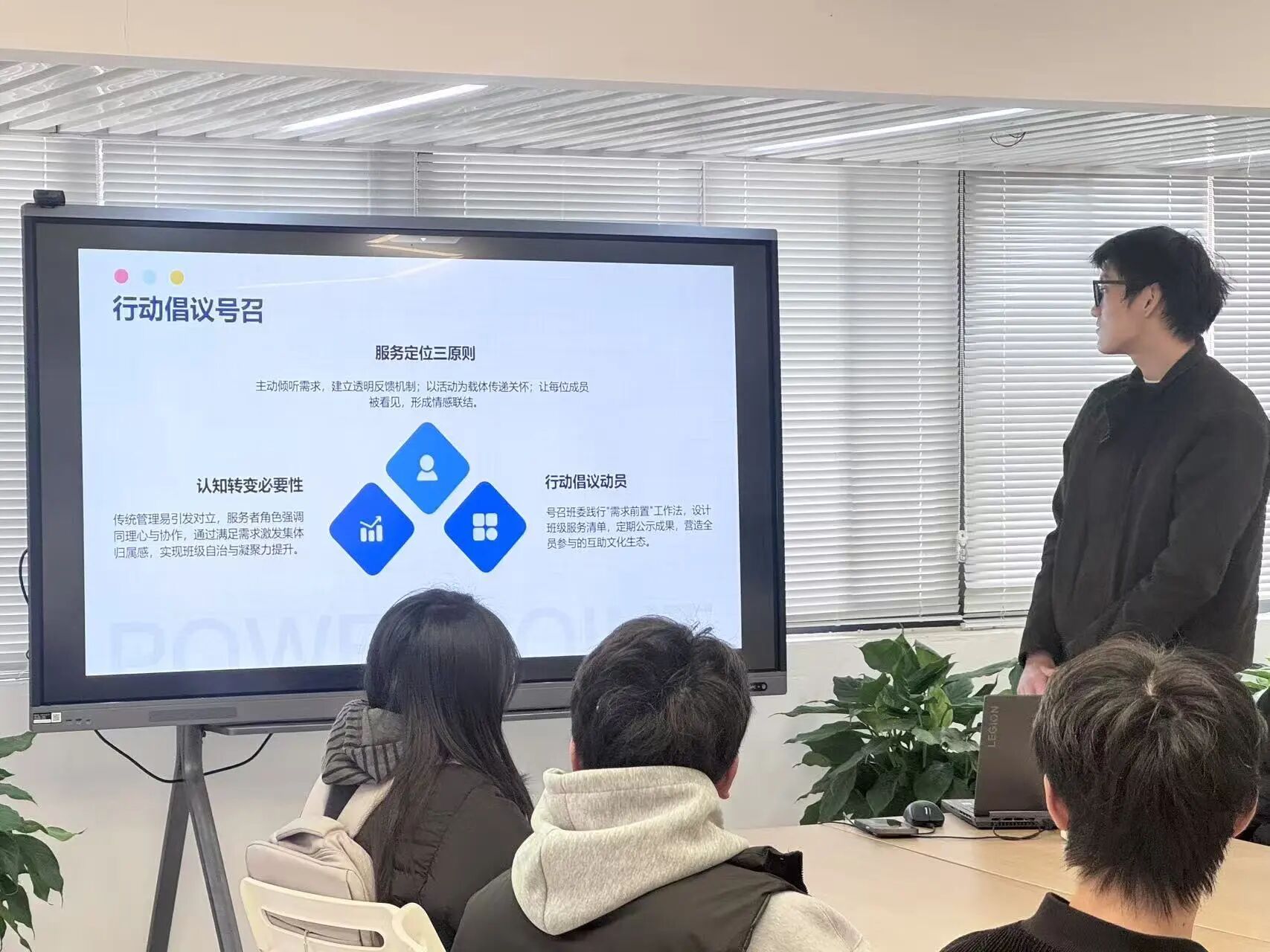 分享会上,叶府紧扣主题展开分享,他提出服务定位三原则,强调班委应主动倾听、建立透明反馈机制,以活动为载体传递关怀,让每位班级成员都能被看见、形成情感联结;他同时剖析了从管理到服务的认知转变必要性,指出传统方式易引发对立,班委需强化同理心与协作意识,通过响应需求激发集体归属感;此外,他还分享了制定班级服务清单、定期公开成果等具体行动方法,推动形成全员参与、互助共进的班级文化生态,为在场班委提供了务实可行的建设思路。