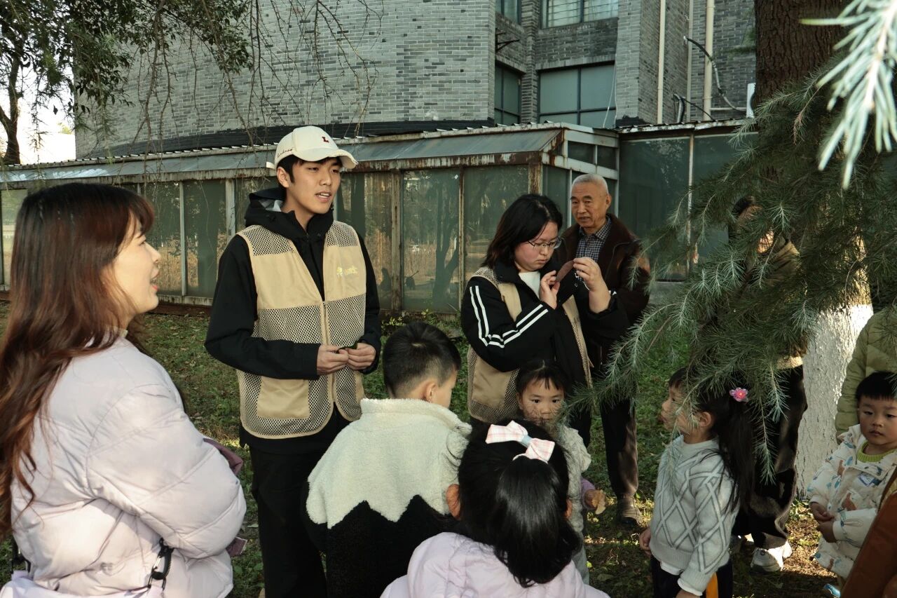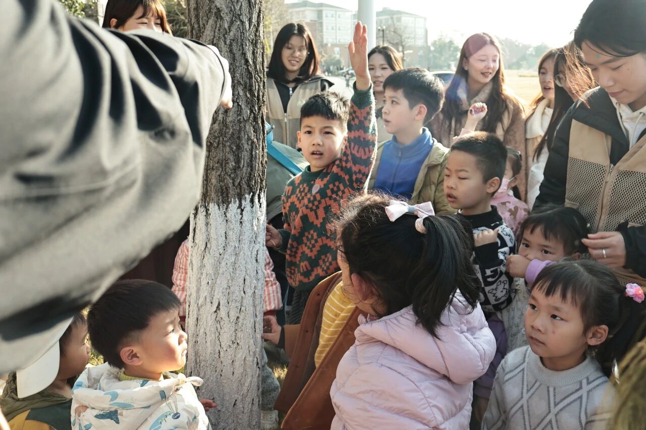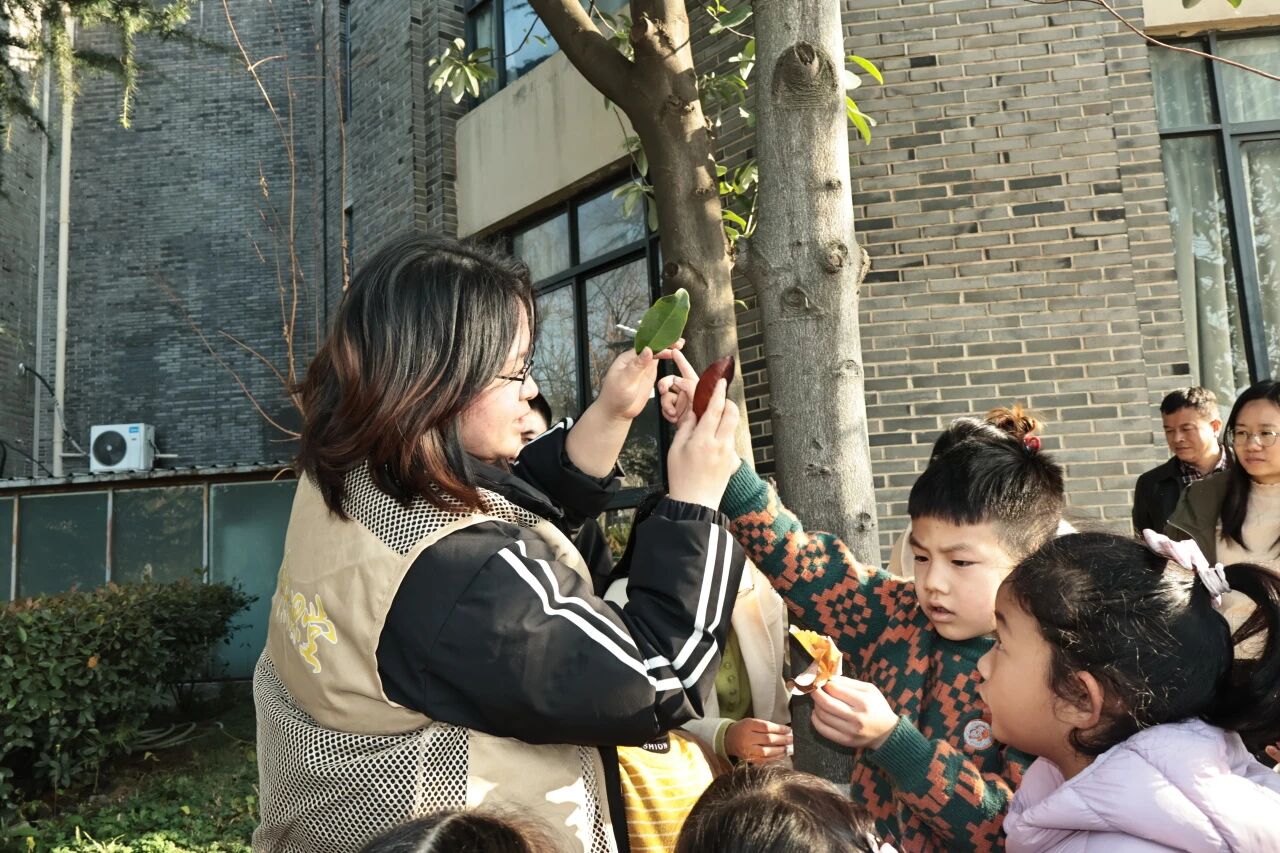 活动在冬日的暖阳里缓缓拉开帷幕,志愿者们化身“自然向导”,带领着孩子们走出温暖的室内,踏入校园湖边草坪了解植物的魅力。这里没有课本上枯燥的文字描述,只有触手可及的自然馈赠:粗糙的树皮纹路藏着树木生长的密码,清晰的叶片脉络勾勒出生命的轨迹,清新的草木清香萦绕在鼻尖,让人忍不住沉醉其中。孩子们的好奇心被瞬间点燃,他们或蹲在树旁仔细观察,或伸手轻拂银杏的扇形叶片,感受那独特的触感;或仰头数着香樟的枝桠,惊叹于树木的高大挺拔;还有的凑近花朵轻嗅芬芳,脸上满是陶醉与欢喜。在与自然的零距离接触中,孩子们一步步解锁着植物世界的小秘密。