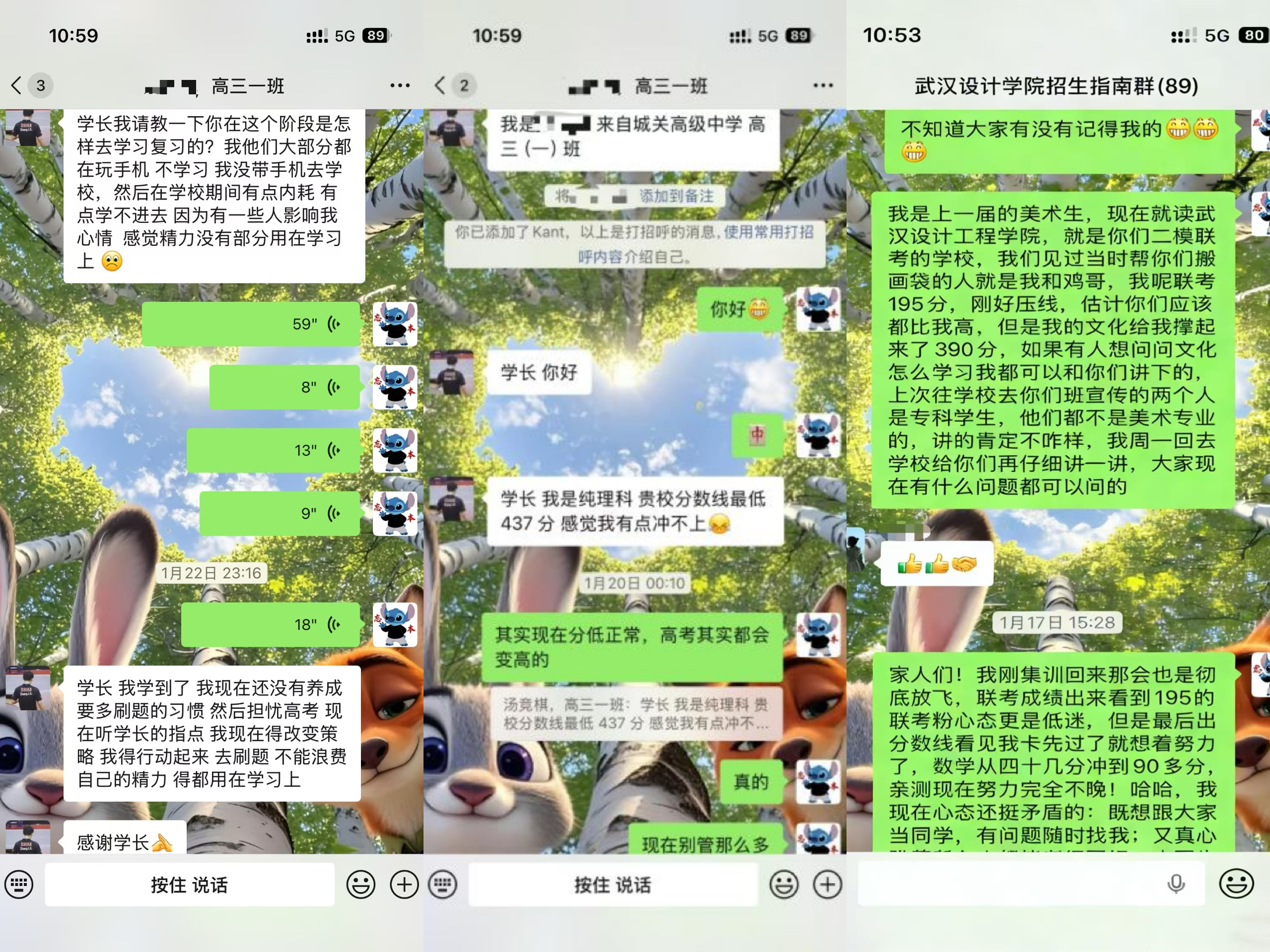 为提升宣讲效果,实践队提前与校方沟通协调。结合学校艺术生较多的特点,校方特别开放录播室作为宣讲主场地,并组织美术生参与专场分享。此外,实践队还走进高三各班进行巡回宣讲,为学子加油鼓劲、传授备考经验;同时利用午休时间,在食堂、教学楼等区域分发招生简章、开展流动讲解,并设置固定咨询点为学弟学妹答疑解惑。