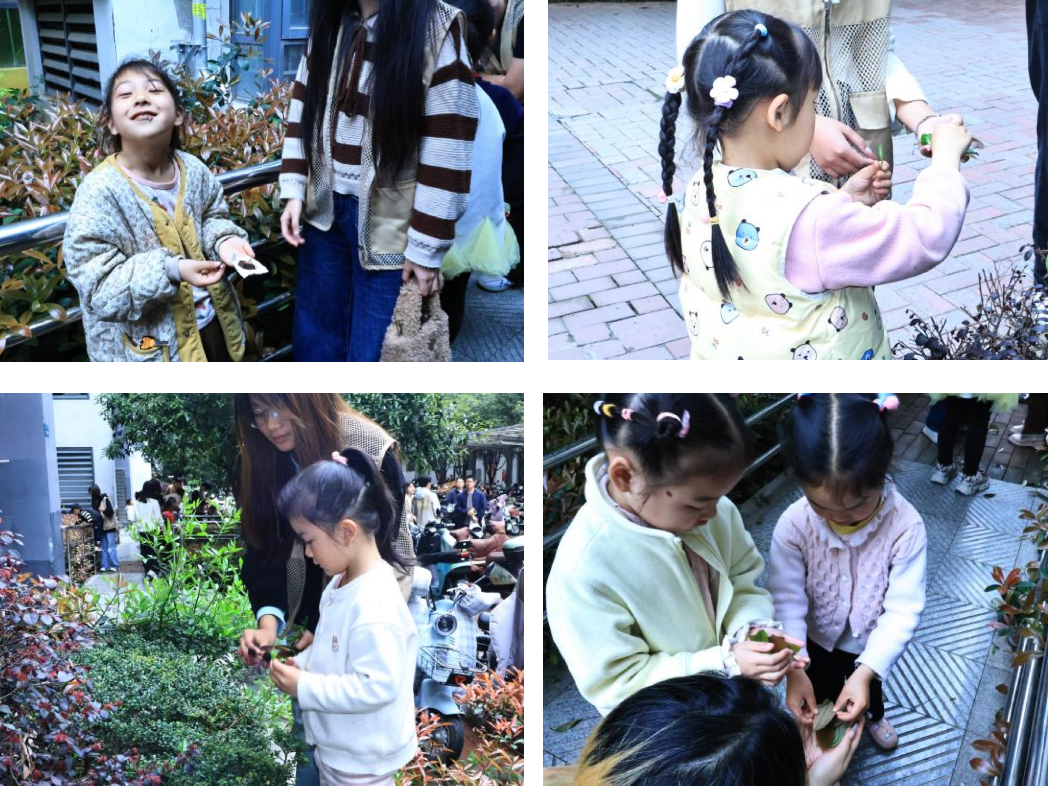 科普环节结束后,志愿者神秘地说:“接下来我们要先去户外‘寻宝’,收集树枝、树叶和松针,这些自然宝贝会成为装饰小鸟家园的秘密武器哦!” 孩子们欢呼着排好队,在志愿者的带领下走进社区的小花园。初春的花园里草木萌发,孩子们弯腰仔细挑选:有的捡起形状规整的落叶,有的收集纤细的树枝,还有的小心翼翼摘下松针,不时互相分享:“你看这片叶子像芦苇!”“这个树枝适合做树干!” 志愿者在一旁提醒大家 “注意不要伤害到花草树木”,引导孩子们在采摘中学会尊重自然、爱护绿植。