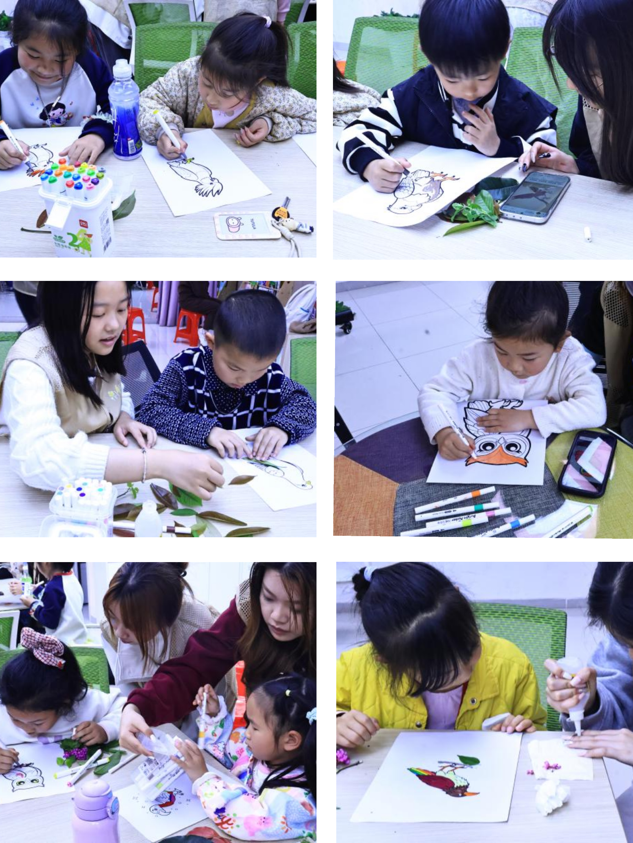 满载 “自然宝藏” 回到活动室,创意手工 “自然拼贴鸟类图鉴” 正式开启。志愿者为每位小朋友发放提前打印好的线稿,上面清晰勾勒出四种鸟类的轮廓,重点突出了独特的喙与脚的形态。桌面上还整齐摆放着水彩笔、马克笔,孩子们刚收集的树枝、落叶、松针等素材散发着草木的清香。“请大家先根发挥自己的想象,给小鸟的喙和脚涂上好看的颜色,再用亲手采摘的树叶花朵,给小鸟拼出好看的背景!” 志愿者的话音刚落,孩子们便迫不及待地投入创作。