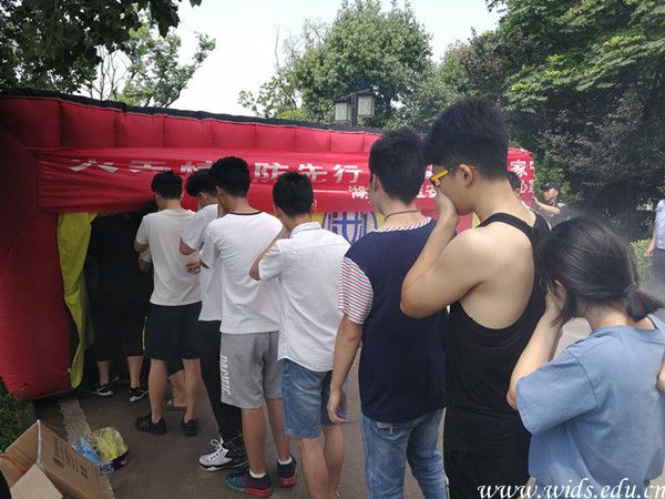 在知识性消防讲座结束完之后,王好教官还带领全体师生去进行模拟性的消防演练,在逃生演习帐篷中,以烟雾模拟的实际状况告诉我们发生火灾时,烟雾弥漫,离开火灾建筑需左手捂住口鼻,右手扶墙移动,这是为了避免延误入鼻造成窒息性危险和烟雾浓厚导致人在火灾中迷失方向,此次模拟让师生亲身体验了,在火灾发生时,自救方法的重要性和实用性。