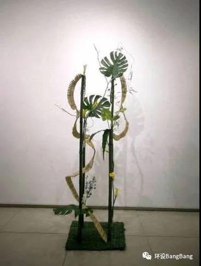 本次插花作品共有5个以现代风与东方插花艺术风格融合,其中主体作品《无限》,总长约4.5米,宽3米,以手工编织的竹篾环绕形成♾形状,是无穷大、无限之意。展示着青春无限,万物可爱,万事尽可期待,是对学子的祝福,未来拥有无限可能,人生的选择丰富多彩,也是祝愿新校区空间无限、发展无限、希望无限。
