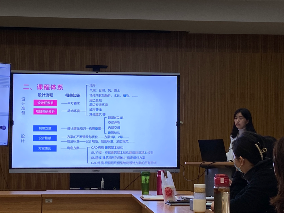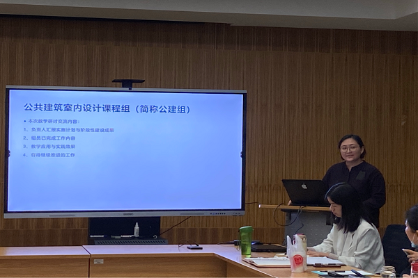 第二议题,任璐老师针对新课题《公共建筑室内设计》课程结构建设内容进行分享。任老师针对实施计划与阶段性成果进行汇报,其中对其组员们完成的阶段性成果进行展示,条理清晰的对课程开展提出详实的实施计划。叶院长也对其工作进行肯定,并对系部老师都提出专业能力都需要更专更精的要求。