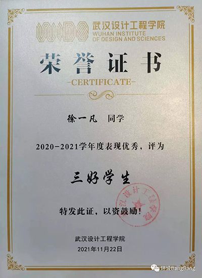 2020-2021学年度徐一凡同学获“三好学生”荣誉称号。